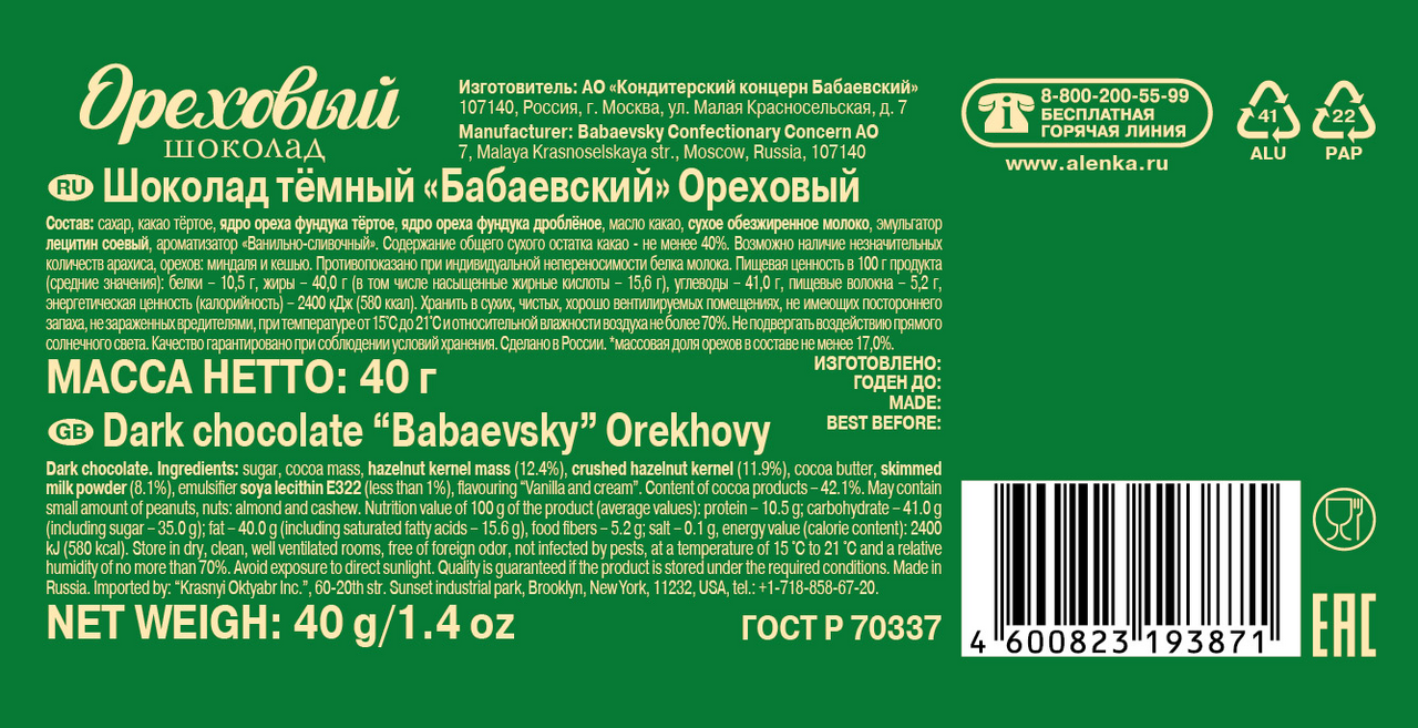 Шоколад Бабаевский ореховый - это ароматный темный шоколад, щедро сдобренный мелкой ореховой дробью. Терпкая горчинка, многогранный, насыщенный вкус настоящего темного шоколада Бабаевский, яркие ванильные нотки и хрустящий жареный фундук. Маленькую плитку удобно брать с собой в качестве сладкого перекуса или изысканного презента: роскошная обертка в шоколадно-золотистых тонах выглядит очень солидно и празднично.