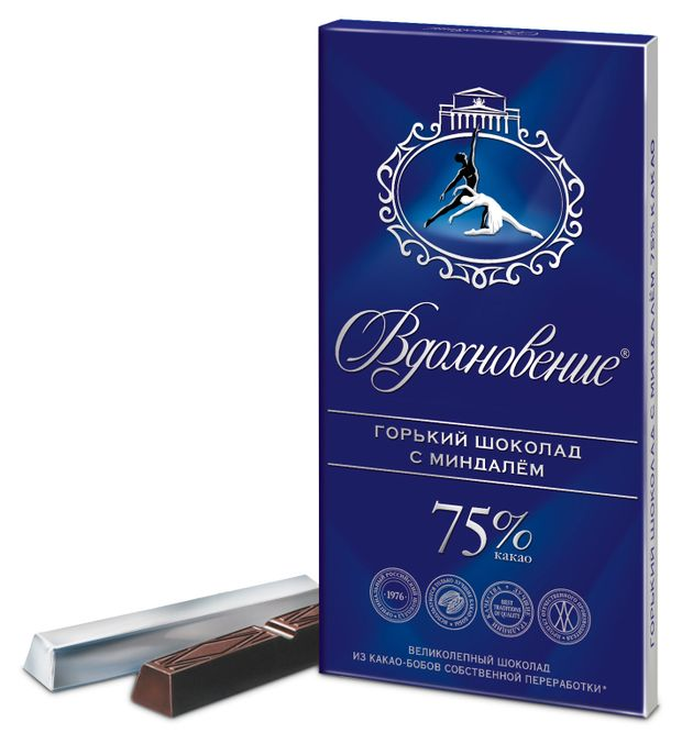 Горький шоколад "Вдохновение" с миндалем — десерт для гурмана. Яркий вкус с тонкой горчинкой и нотками миндаля идеально подчеркнет черный кофе, например, эспрессо или американо. Упаковку изящного десерта украшает сюжет на тему русского балета. Вот уже более 40 лет "Вдохновение" радует ценителей неизменно изысканным вкусом и непревзойденным качеством.