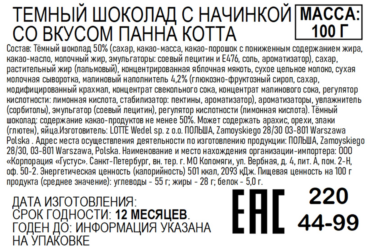 Тёмный шоколад E.Wedel с начинкой Панна Котта (100г).Изысканное лакомство, покоряющее с первого кусочка. В нём идеально сочетаются:- терпкость тёмного шоколада (из отборных какао-бобов из Ганы);- нежная молочная начинка со вкусом итальянской панна котты;- ароматный малиновый конфитюр. Каждый кусочек - маленькое путешествие: благородная горчинка шоколада плавно переходит в сливочную негу начинки, оставляя бархатистое послевкусие. Консистенция шоколада идеально сбалансирована. Десерт станет украшением чаепития: гармонично сочетается с чаем и кофе. Особенности:- аутентичная рецептура E.Wedel - гарантия качества; - натуральные ингредиенты: отборные какао-бобы, сливки; - удобная упаковка: есть указатель для открытия, после вскрытия можно закрыть (края приклеиваются), что сохраняет свежесть лакомства. Вековая история бренда E.Wedel - залог превосходного вкуса.