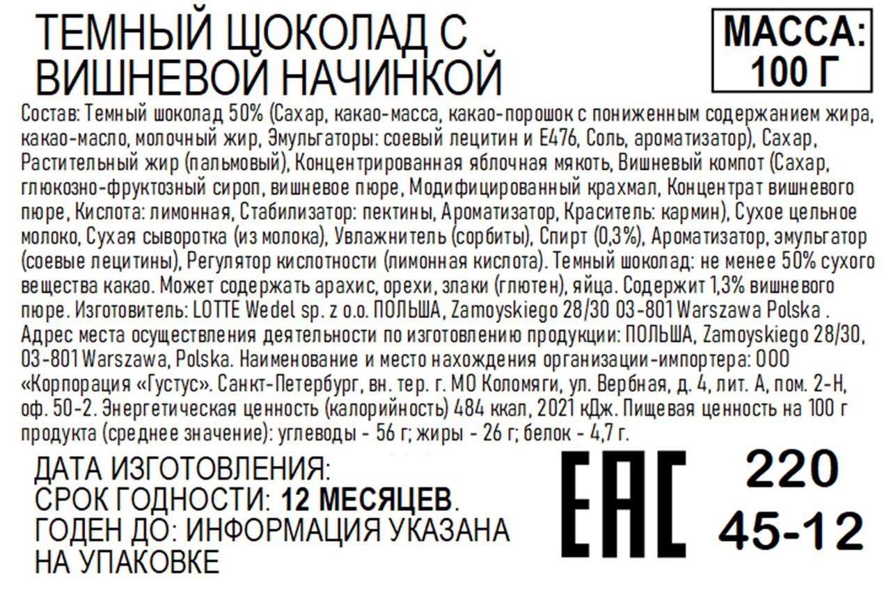 Тёмный шоколад сахар, какао-масса, какао-порошок с низким содержанием жира, какао-масло, молочный жир, эмульгаторы: соевый лецитин и E476, соль, ароматизатор; сахар; растительное масло пальмовое; концентрированная яблочная мякоть; заготовка вишни сахар, глюкозно-фруктозный сироп, вишнёвое пюре, модифицированный крахмал, концентрат вишнёвого пюре, регулятор кислотности: лимонная кислота, стабилизатор: пектин, ароматизатор, натуральный пищевой краситель: кармин; сухое цельное молоко; сухая молочная сыворотка; увлажнитель сорбитол; алкоголь; ароматизаторы; эмульгатор соевый лецитин; регулятор кислотности лимонная кислота.