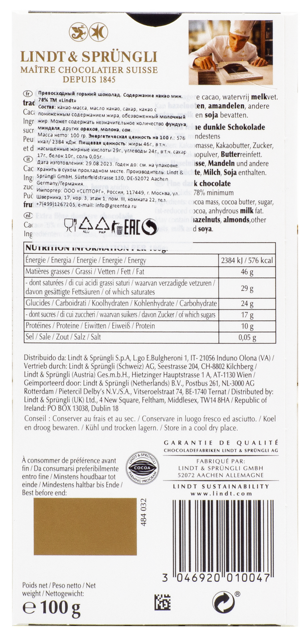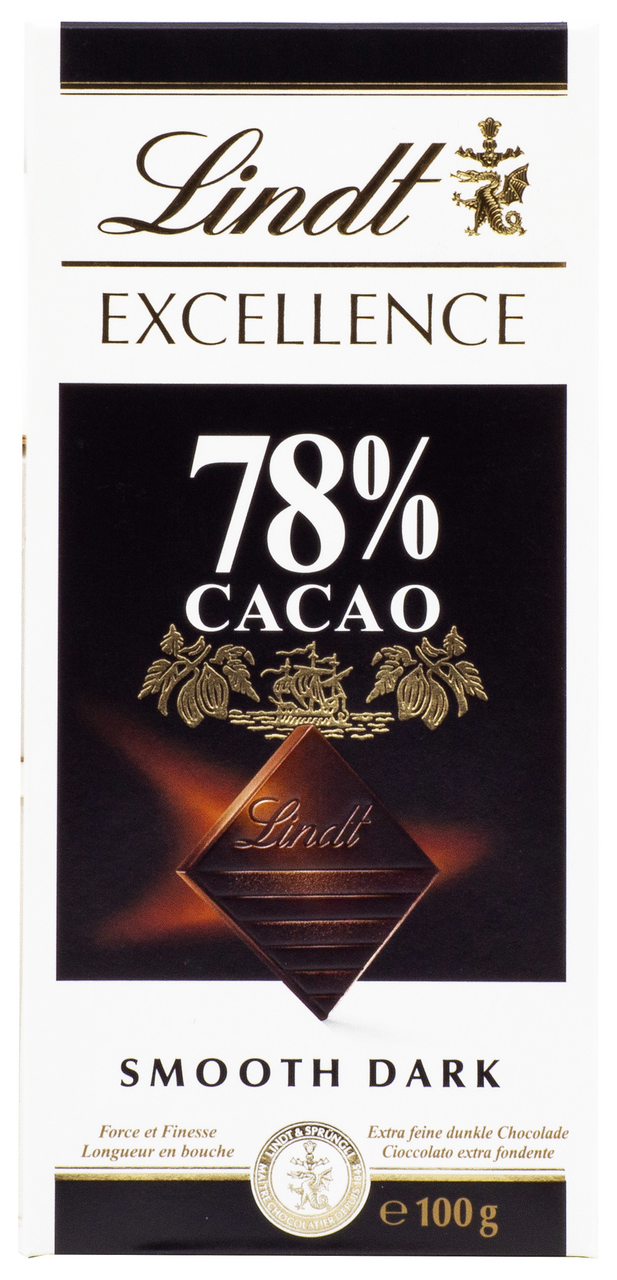 Превосходный темный шоколад высочайшего качества с терпким ароматом какао, легкими нотками обжаренных орехов и нежной текстурой, который буквально тает во рту. Это изысканный горький шоколад высочайшего качества с ярко выраженным, нетерпким ароматом какао, нежной текстурой и нотками обжаренных орехов. Это изысканное лакомство с выраженным, немного терпким вкусом и ароматом какао. Пробуя этот традиционный сорт, можно уловить изысканные нотки фруктов и цветов, а также едва ощутимый ванильный оттенок. Такой шоколад понравится настоящим гурманам. Он идеально дополнит чашечку горячего ароматного кофе на завтрак. Все ингредиенты для шоколада Lindt Excellence отбираются тщательнейшим образом, а каждый этап его производства контролируется профессионалами. Для изготовления этой плитки шоколада использовано 78% процентов высококачественного какао-порошка, благодаря чему рождается терпкий и яркий вкус какао, разбавленный пряными нотами лесных орехов.
