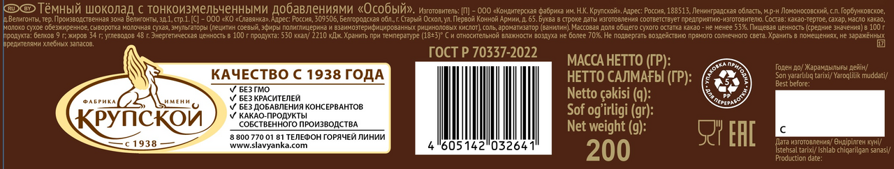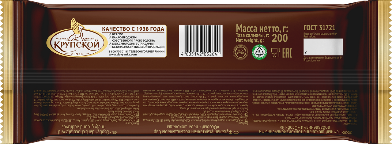 Шоколад Кондитерская фабрика Крупской темный особый, 200г