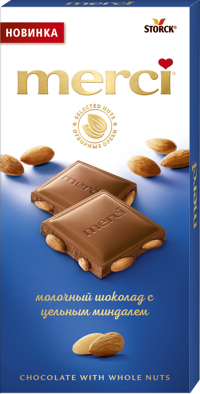 Теперь любимые плитки merci с отборными цельными орехами! Новые плитки merci с цельными орехами - гармоничное сочетание великолепного шоколада и отборных цельных орехов, которое создает по-настоящему изысканное удовольствие. Шоколадные плитки merci c цельными орехами представлены в трех популярных вкусах: Молочный шоколад с цельным лесным орехом, Молочный шоколад с цельным миндалем, Темный шоколад с цельным миндалем. Насладитесь шоколадом merci!