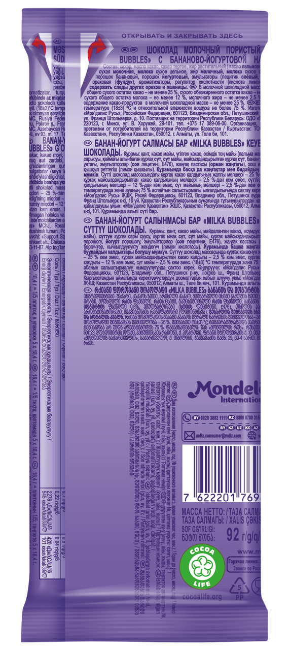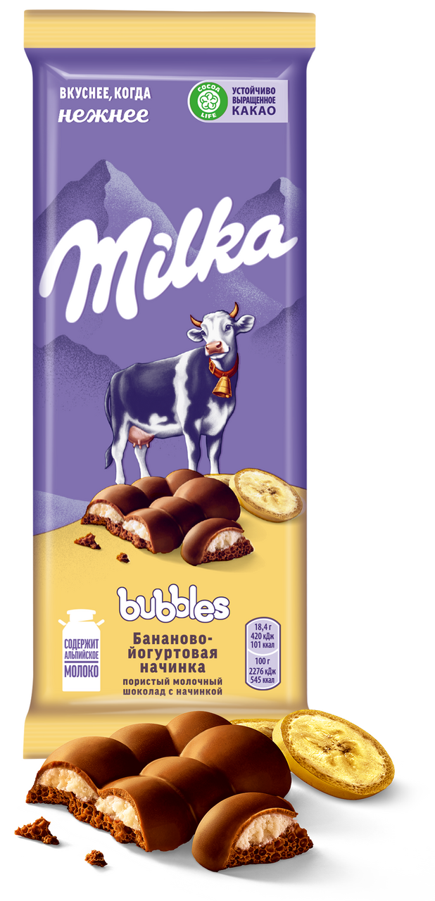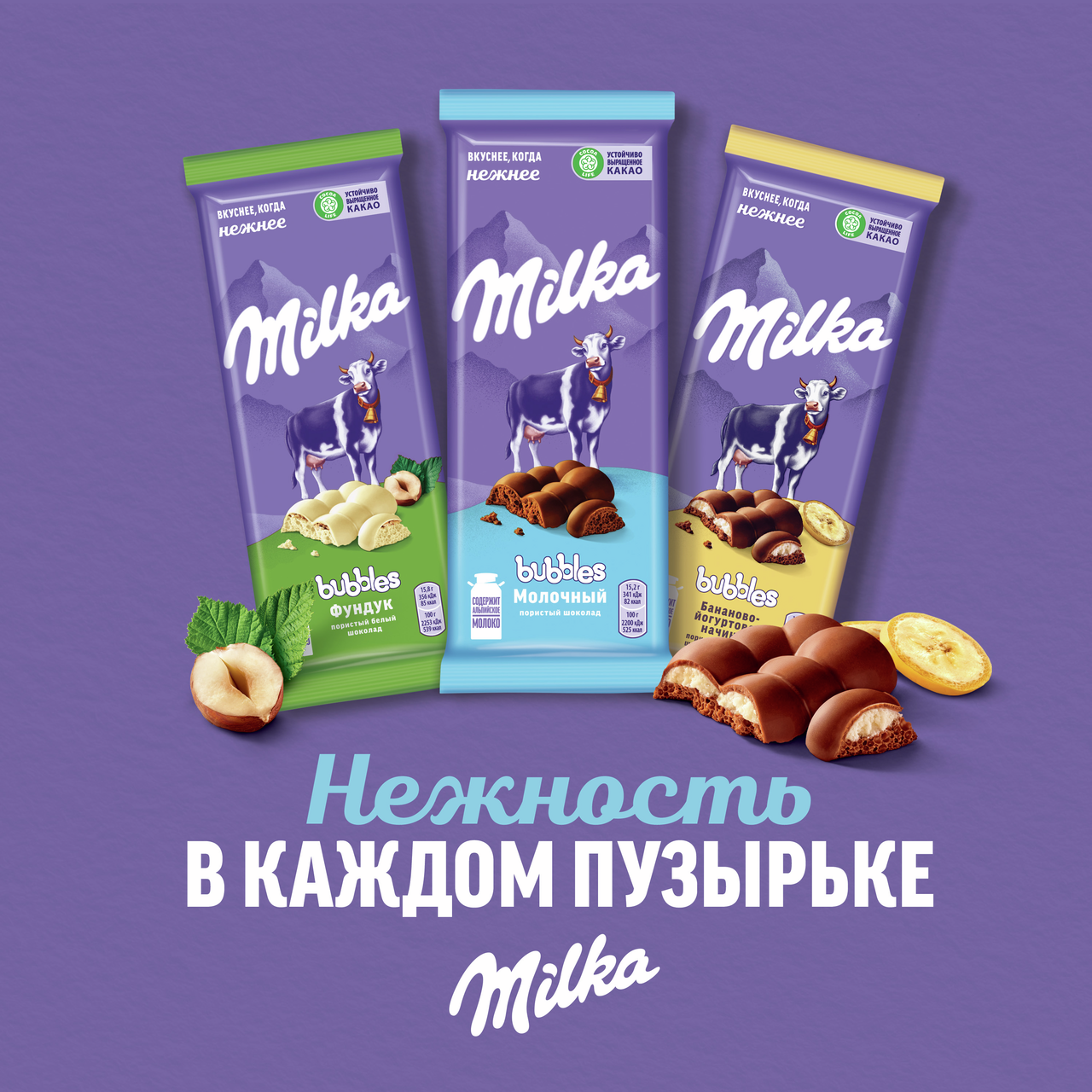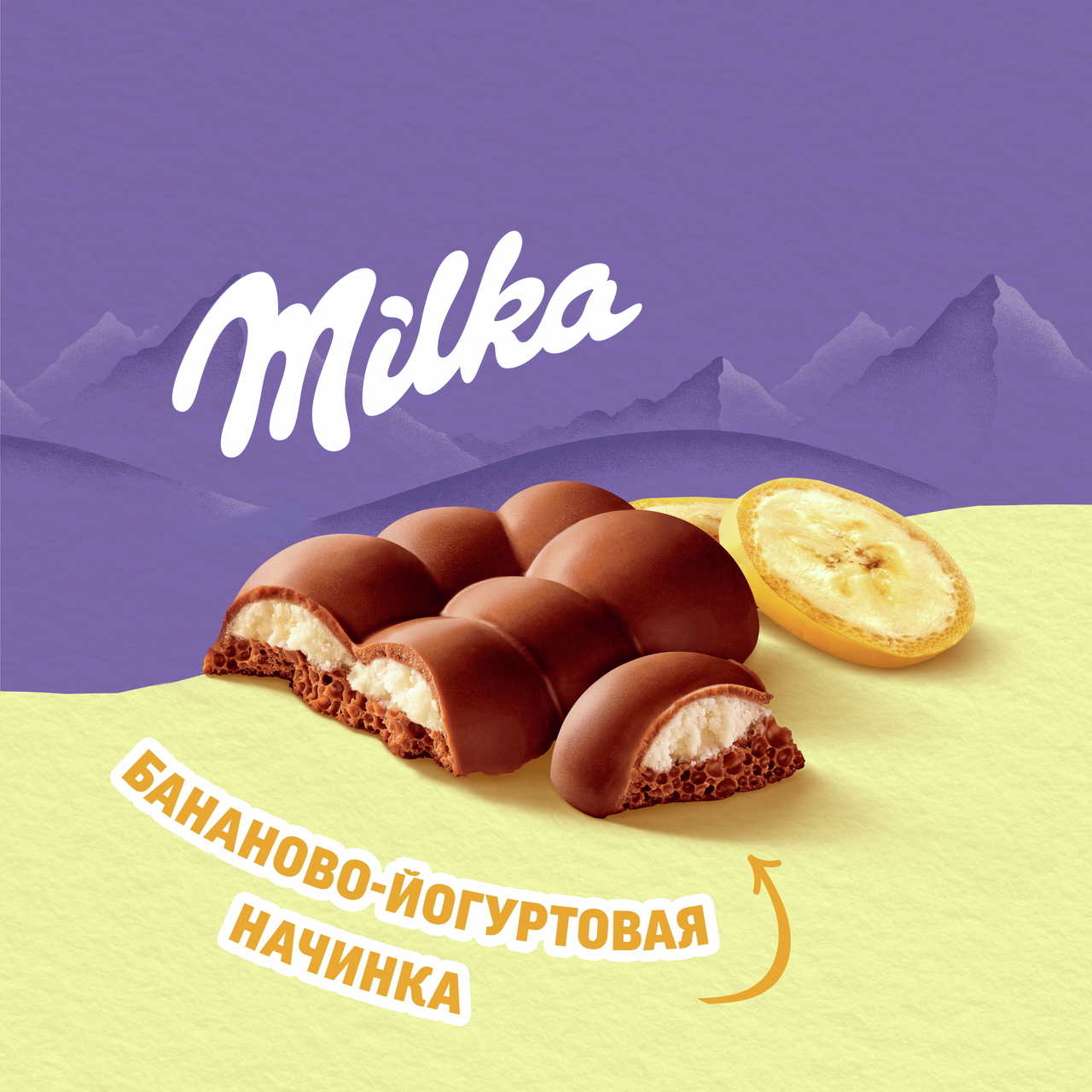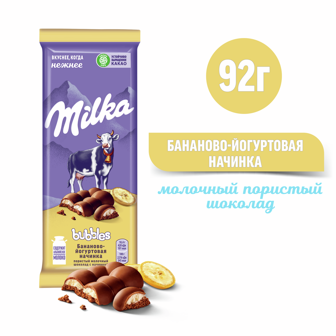 Шоколад Milka Bubbles молочный пористый с бананово йогуртовой начинкой, 92г