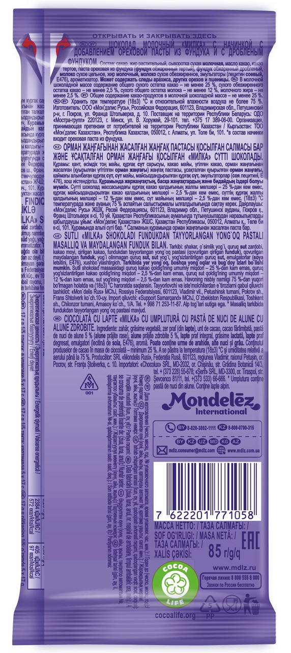 Шоколад Milka молочный с добавлением ореховой пасты из фундука и дробленым фундуком, 85г