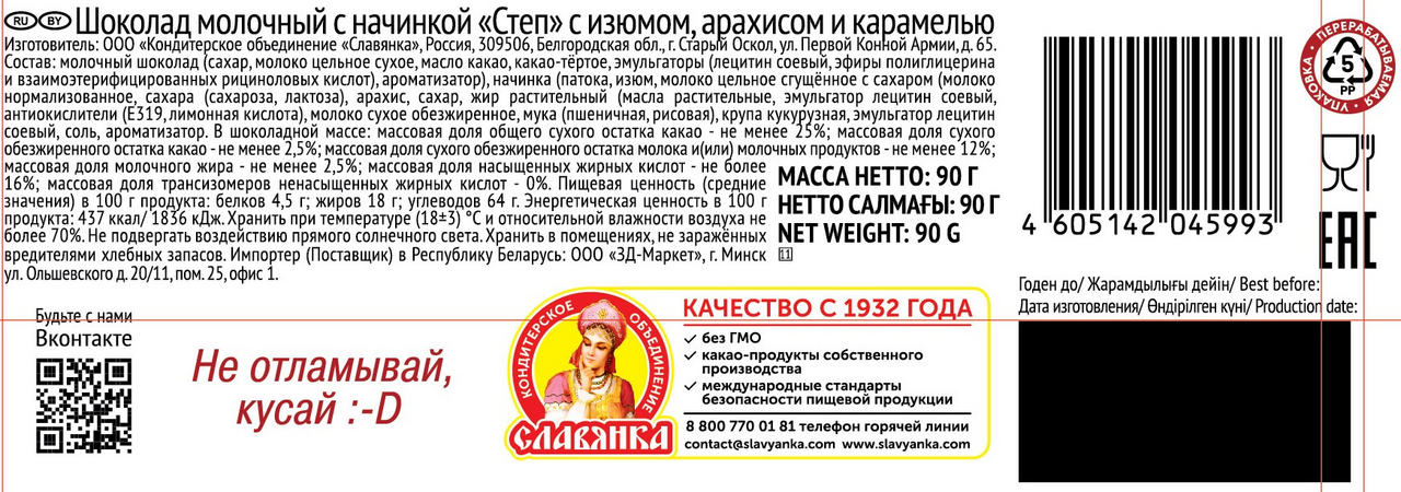 Шоколад молочный Степ Изюм-арахис-карамель, 90г
