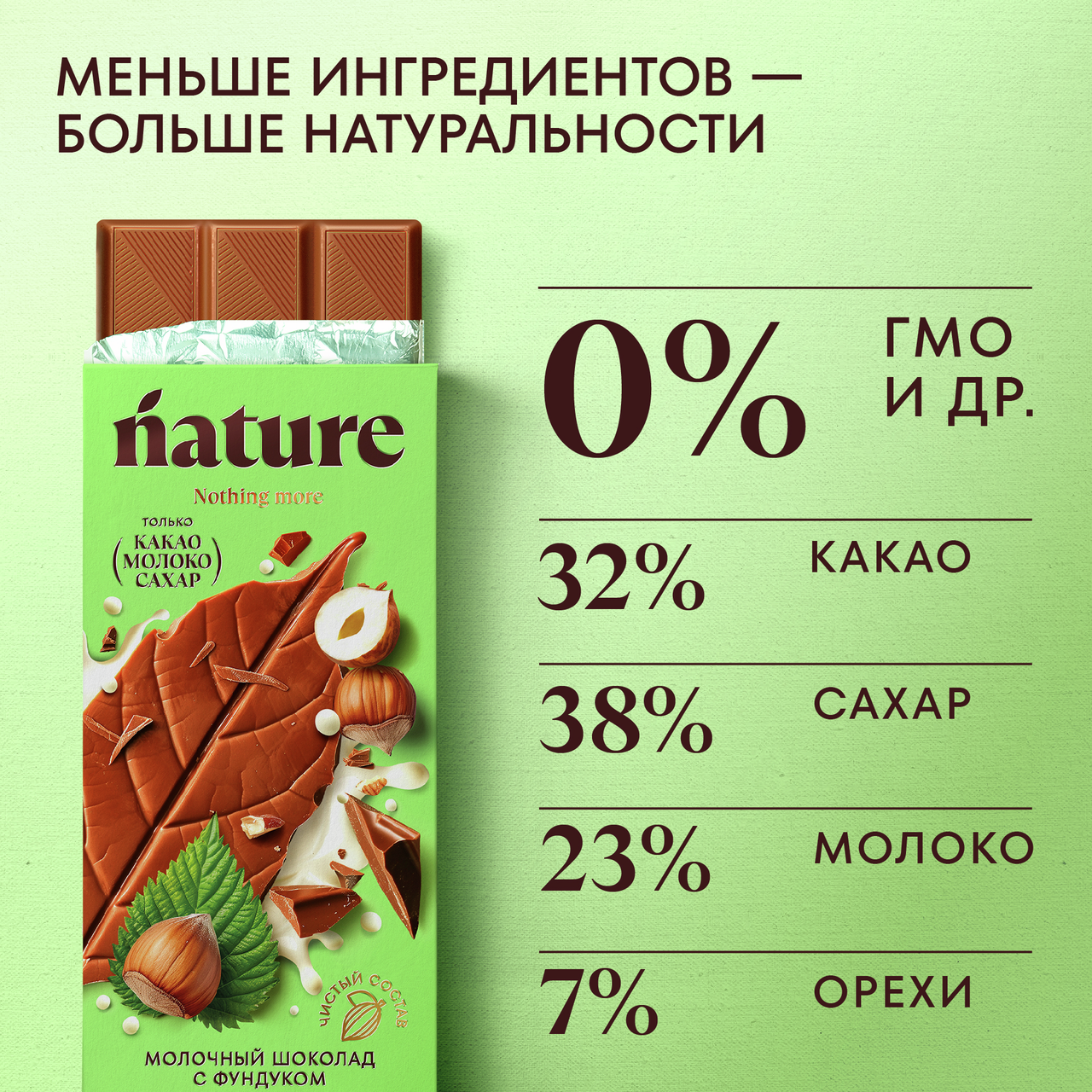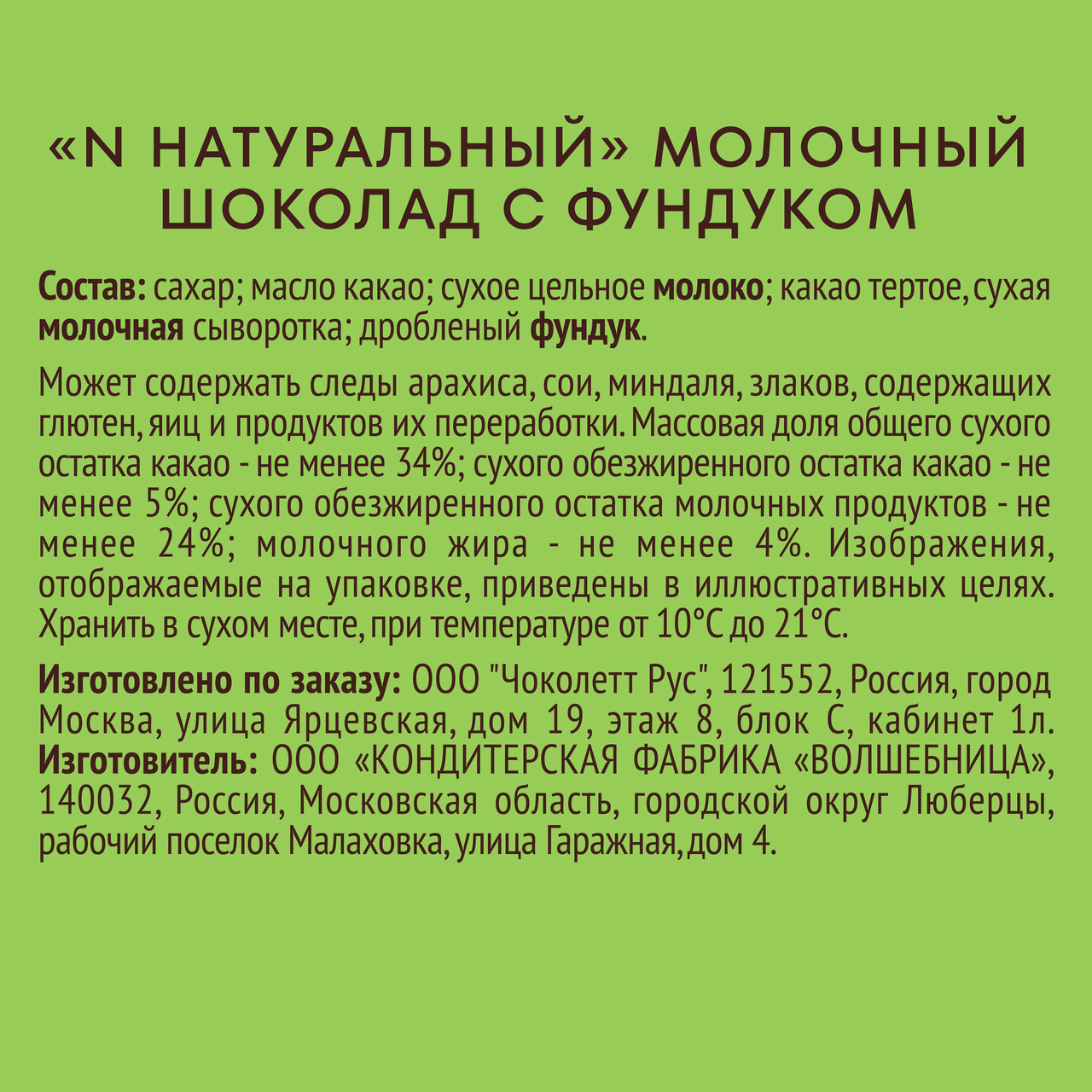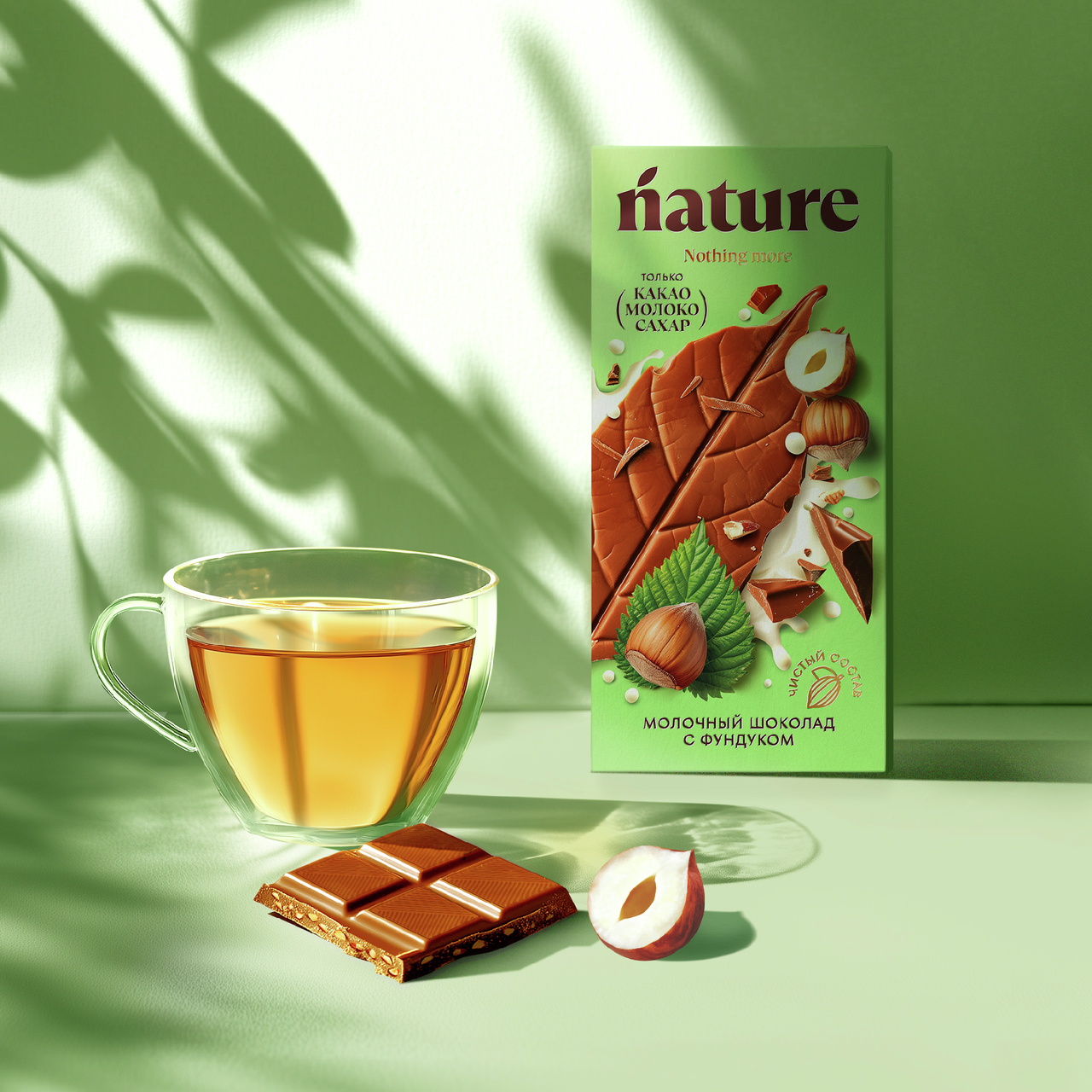 N Nature - линейка шоколада с чистым составом: только какао и сахар + молоко, орехи или ягоды в некоторых вкусах. Производится на основе классического рецепта молочного шоколада. Чистый состав. Приготовлен из натуральных ингредиентов без искусственных красителей, ароматизаторов и Е-добавок. Для приготовления используются отборные какао-бобы с Берега Слоновой Кости: именно они максимально раскрывают вкус и аромат настоящего шоколада. Молочные продукты и орехи оттеняют вкус и делают его нежнее. Продукты питания под брендом Nature изготавливаются на современной фабрике в соответствии со стандартами качества BRC.
