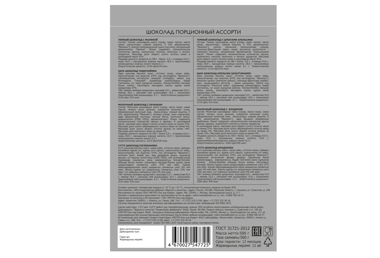 Темный шоколад с малиной: темная шоколадная масса (сахар, какао тертое, масло какао, эмульгаторы: соевый лецитин, Е476, ароматизатор Ванилин), малина сублимированной сушки (кусочки), натуральный ароматизатор Малина; темный шоколад с цукатами апельсина: темная шоколадная масса (сахар, какао тертое, масло какао, эмульгаторы: соевый лецитин, Е476, ароматизатор Ванилин), цукаты апельсина (апельсиновая кожура, глюкозно-фруктозный сироп, сахар, регулятор кислотности – лимонная кислота), натуральный ароматизатор Апельсиновое масло; молочный шоколад с печеньем: молочная шоколадная масса (сахар, масло какао, какао тертое, молоко сухое цельное, сыворотка молочная сухая, обезвоженный молочный жир, эмульгаторы: соевый лецитин, Е476, ароматизатор Ванилин), печенье (сахар, мука пшеничная, ядро абрикосовой косточки, яичный белок, молочный белок, разрыхлитель (Е500, Е503), ароматизаторы); молочный шоколад с фундуком: молочная шоколадная масса (сахар, масло какао, какао тертое, молоко сухое цельное, сыворотка молочная сухая, обезвоженный молочный жир, эмульгаторы: соевый лецитин, Е476, ароматизатор Ванилин), ядра фундука обжаренные дробленые.