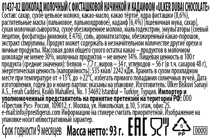 Шоколад Ulker Дубайский с фисташковой начинкой и кадаифом, 93г x 6 шт - молочный шоколад с фисташковым пралине и кадайфи. Этот соленый и сладкий десерт идеально подходит для настоящих гурманов, которые ценят нестандартные и насыщенные вкусы. Каждая плитка шоколада представляет собой гармоничное сочетание традиционных восточных ингредиентов и современных технологий производства. Фисташки до��авляют хрустящую текстуру и неповторимый ореховый вкус, а кадайиф - легкую сладость и оригинальность, делая этот продукт идеальным вариантом для угощения или подарка. Помимо исключительного вкуса, данный шоколад является отличным источником счастья и радости, который украсит любое торжество или станет приятным дополнением к вашему дню.