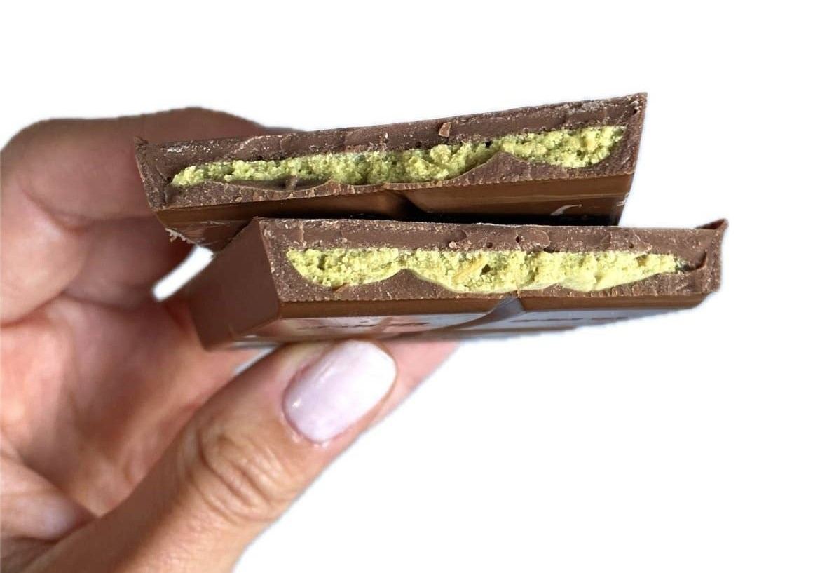 Сахар, сухое цельное молоко, какао-масло, какао тёртое, ядра фисташки, растительные масла пальмовое, пальмоядровое, кадаиф (пшеничная мука, сахар), сухая молочная сыворотка, сухое обезжиренное молоко, мальтодекстрин, эмульгаторы соевый лецитин, фосфатиды аммония, Е476, соль, ароматизаторы, обезжиренный какао-порошок, экстракт спирулины.