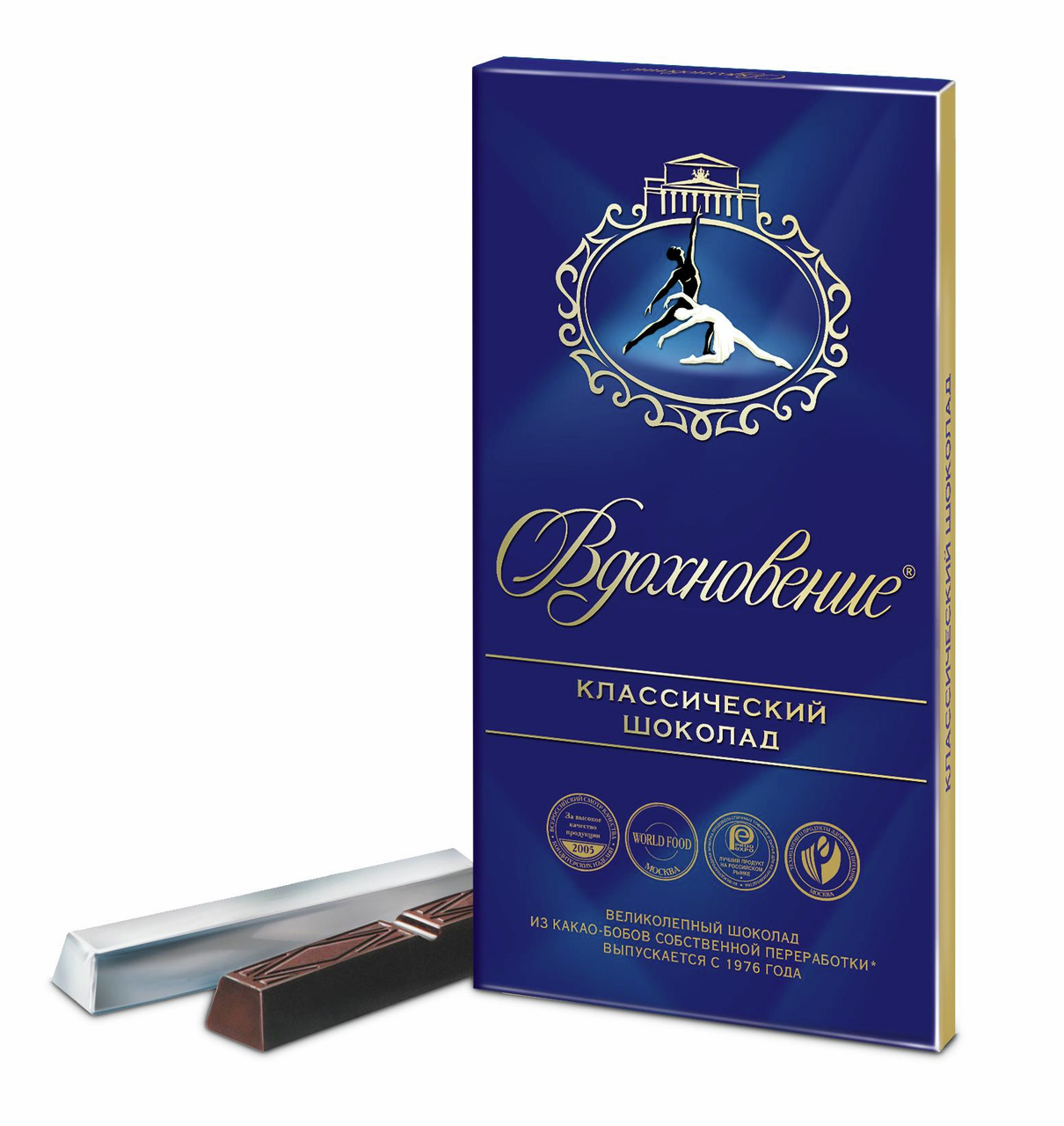 Вдохновение – классический темный шоколад. В его состав входит дробленый жареный фундук и коньяк. Продукт изготавливается по оригинальной рецептуре 1976 года. В каждой упаковке вы найдете 10 стиков или мини-плиток, которые порадуют вас своим чудесным вкусом, улучшат настроение и придадут жизненные силы.