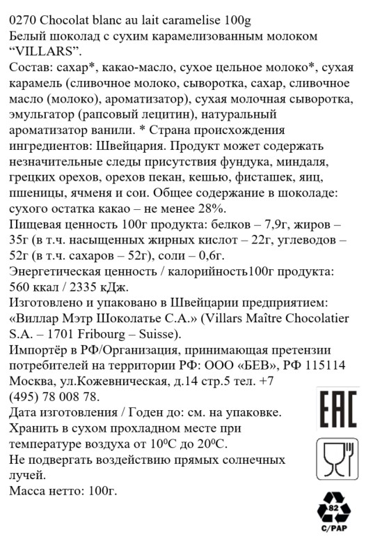 Швейцарский шоколад премиум-класса, производимый на фабрике Villars с 1901 года. Высочайшее качество шоколада обусловлено многолетним опытом мэтров-шоколатье, обжаркой какао-бобов прямо на фабрике, а так же первосортными местными ингредиентами. Попробуйте настоящий белый шоколад премиум класса от швейцарских шоколатье. Натуральное какао-масло, альпийское молоко и натуральная ваниль с острова Мадагаскар - вот секрет волшебной нежности и изысканного молочного вкуса этого шоколада.100% сделано в Швейцарии. Изысканная разновидность белого шоколада премиум класса от швейцарских шоколатье: насыщенного золотисто-коричневого цвета, с удивительным для шоколада вкусом молочных ирисок и лёгким привкусом солёного печенья.