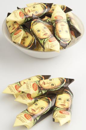 Шоколадные конфеты ''Аленка''. Состав: шоколадная глазурь (сахар, какао тертое, эквивалент масла какао,какао-порошок, эмульгаторы Е322, Е476, ароматизатор идентичный натуральному ''Ваниль''), сахар, масло какао, вафли листовые (мука пшеничная, масло подсолнечное, соль поваренная, эмульгатор Е322, разрыхлитель сода пищевая), сухое цельное молоко, ядро ореха фундука тертое, арахис тертый, какао тертое, эмульгатор Е322, ароматизатор идентичный натуральному ''Ванильно-сливочный'', антиокислитель Е306. Противопоказано при индивидуальной непереносимости белка молока. Возможно наличие следов миндаля. В 100 г продукта содержится: белки - 6,6г; жиры - 31,2 г; углеводы -57,0г. Энергетическая ценность - 526 ккал/100 г. Хранить при температуре от 15 до 21С и относительной влажности воздуха не более 75%. Не подвергать воздействию прямого солнечного света. Срок годности 9 месяцев.