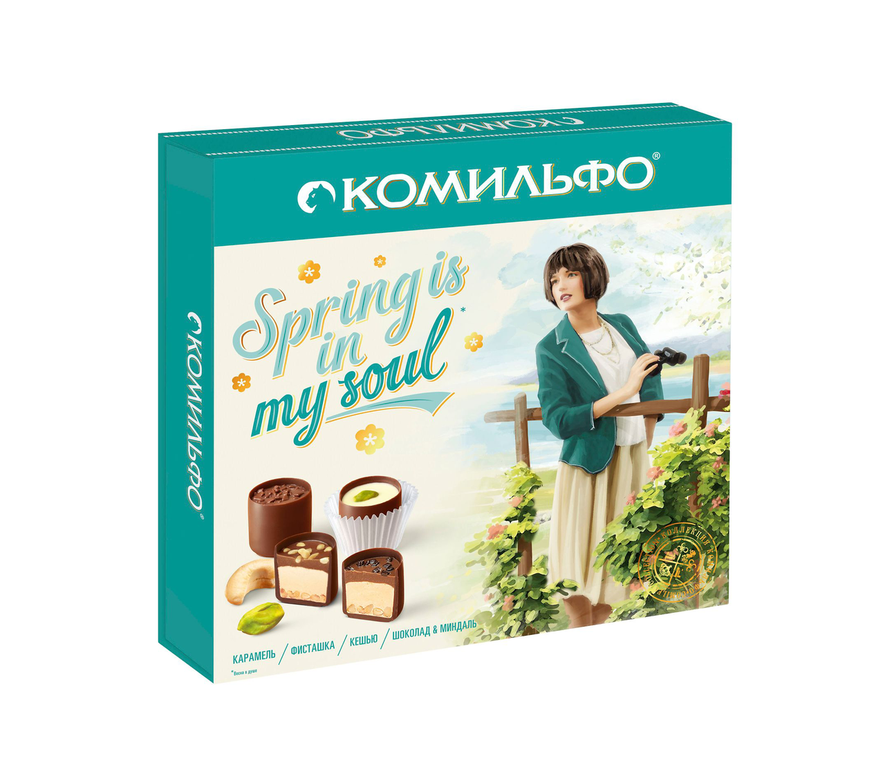 Коллекция шоколадных конфет Комильфо. В наборе собраны конфеты с двухслойной начинкой (карамель, фисташка, кешью и грецкий орех).Состав: сахар, какао тертое, жиры специального назначения, какао масло, орех кешью, молоко сухое цельное и обезжиренное, лактоза, фисташки, молокосодержащий карамелизованный порошок, орех пекан, сыворотка молочная сухая, грецкий орех карамелизованный, фундук, жир молочный, какао-порошок, спред растительно-жировой, эмульгаторы, мальтодекстрин, эквивалент какао-масла, сироп глюкозы, ароматизаторы натуральный и идентичные натуральным, антиокислители, соль, экстракт ванили. Какао в шоколадной массе не менее 25%. Продукт может содержать незначительное количество арахиса, других орехов, яичного белка и глютена. Срок годности: 9 месяцев. Хранить при температуре 18+-3С и относительной влажности не более 75%.