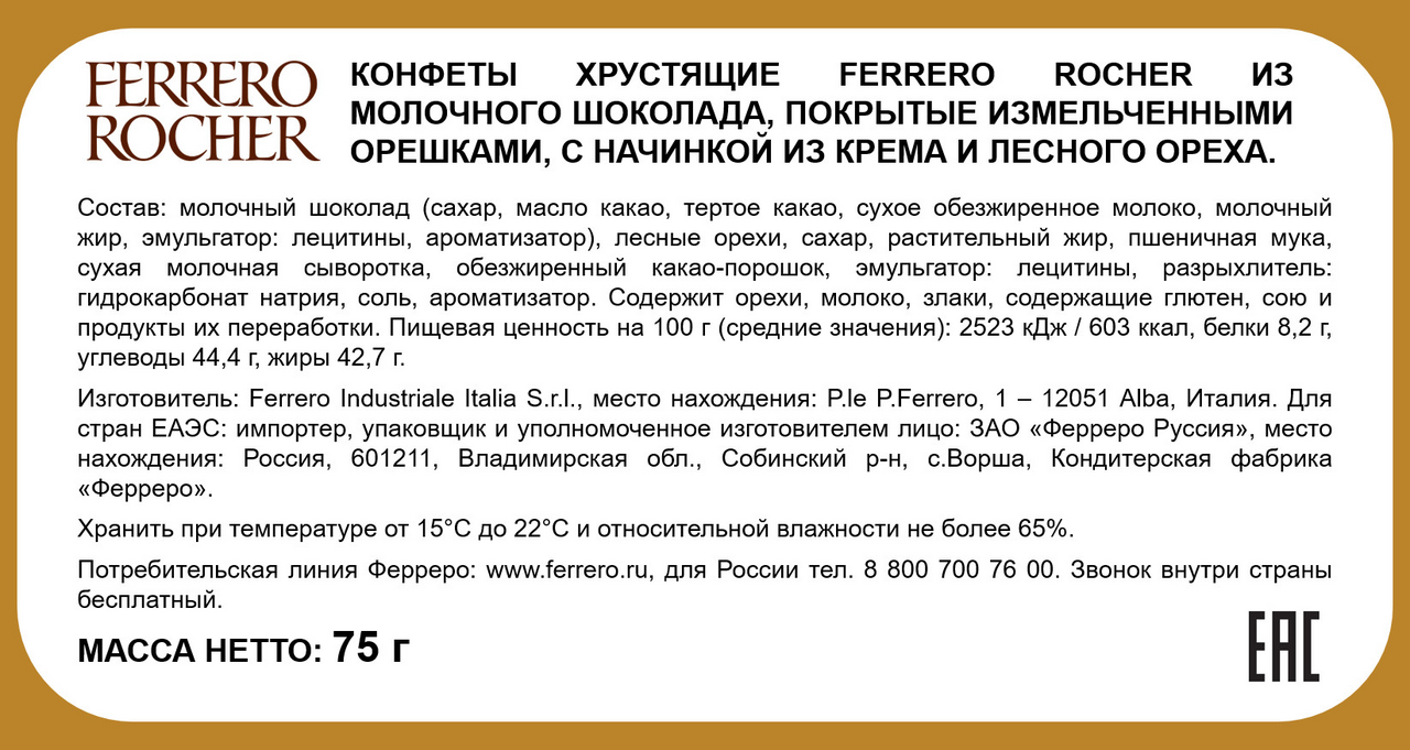 Что мы ценим больше всего в жизни? Время, проведенное со своей семьей, любовь, настоящую дружбу, - чувства, которые мы испытываем, когда близкие люди рядом. Такие моменты заслуживают того, чтобы их отпраздновали по-особенному, потому что минуты радости становятся еще более запоминающимися вместе с Ferrero Rocher. Сочетание цельного фундука и восхитительного сливочно-орехового крема в хрустящей вафельной оболочке подарит вам неповторимые вкусовые ощущения. А уникальная золотистая упаковка делает конфеты Ferrero Rocher еще более изысканными. Разделите удовольствие, наслаждаясь их вкусом в компании близких людей. Ferrero Rocher помогает нам быть ближе с теми, кого мы любим и ценим.