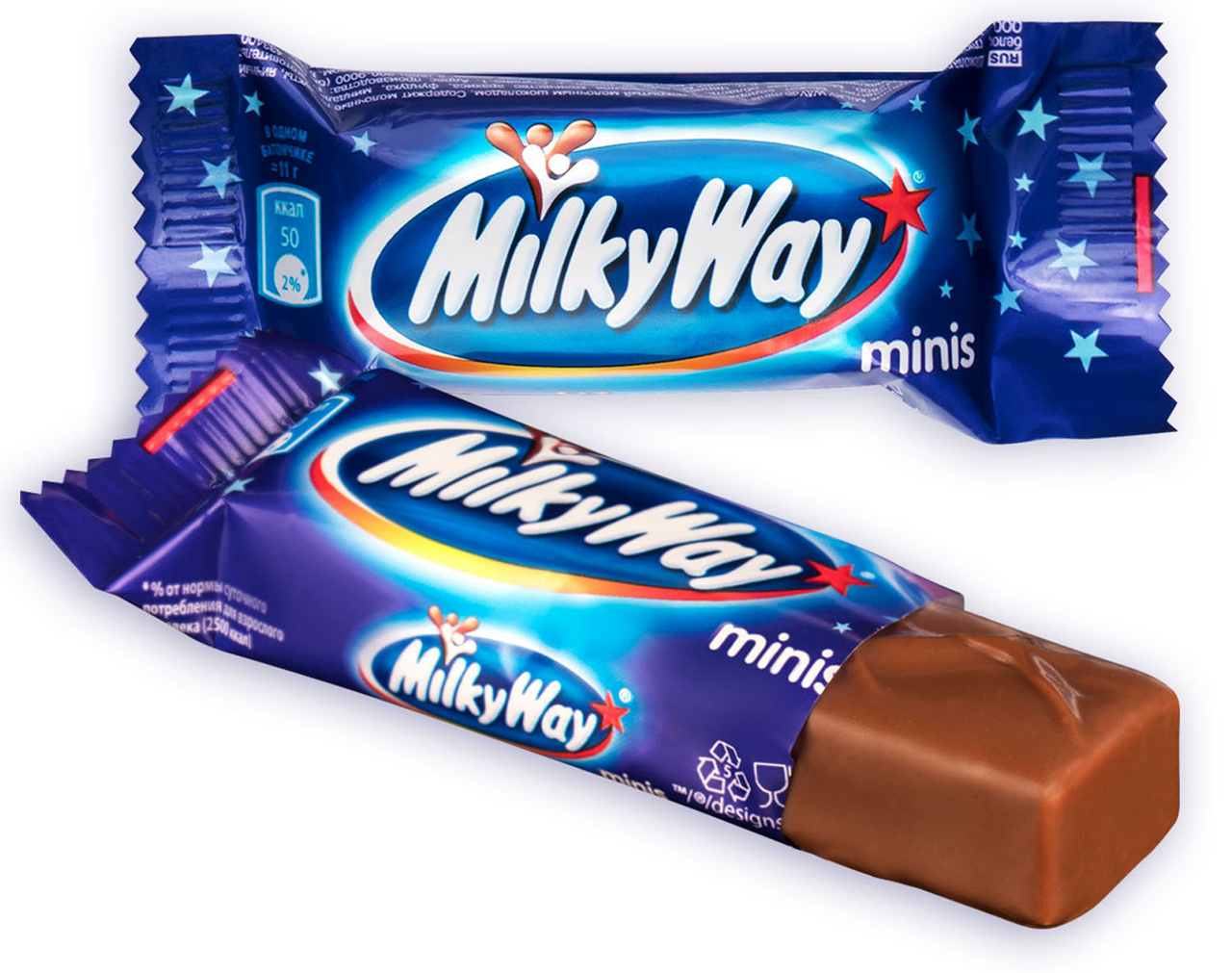 Milky Way Minis - конфеты, состоящие из нуги, которая намного легче молока. Молочный шоколад, которым покрыт Milky Way, делает вкус конфет незабываемо нежным. Порадуйте юных сладкоежек, купите им Milky Way, а они обязательно с вами поделятся.