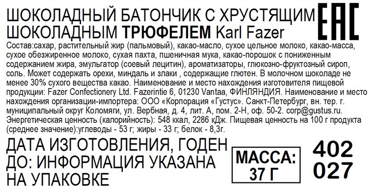 Шоколадный батончик Fazer Karl хрустящий трюфель, 37г