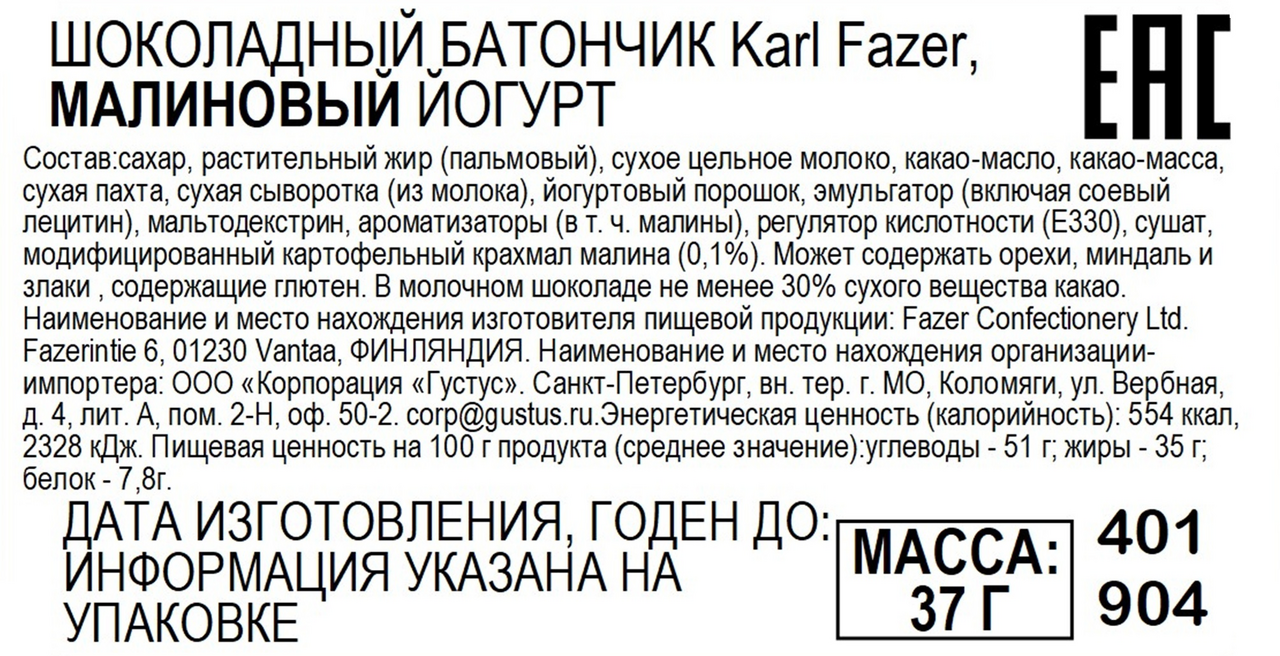 Сахар, эквивалент масла какао рафинированное дезодорированное фракционированное растительное масло пальмовое, молоко сухое цельное, масло какао, какао тёртое, порошок пахты, сыворотка молочная сухая, порошок йогуртовый, эмульгатор лецитины, в том числе соевый, загуститель – мальтодекстрин, ароматизаторы, регулятор кислотности – лимонная кислота, малина сушёная, загуститель - модифицированный картофельный крахмал.
