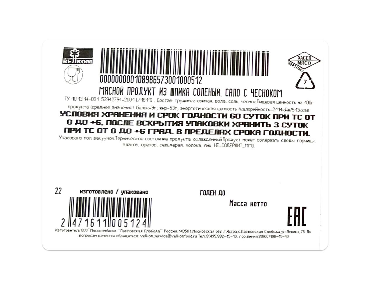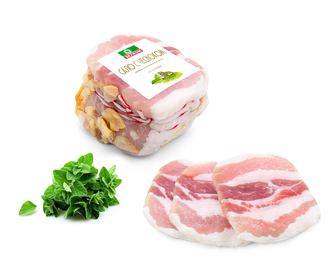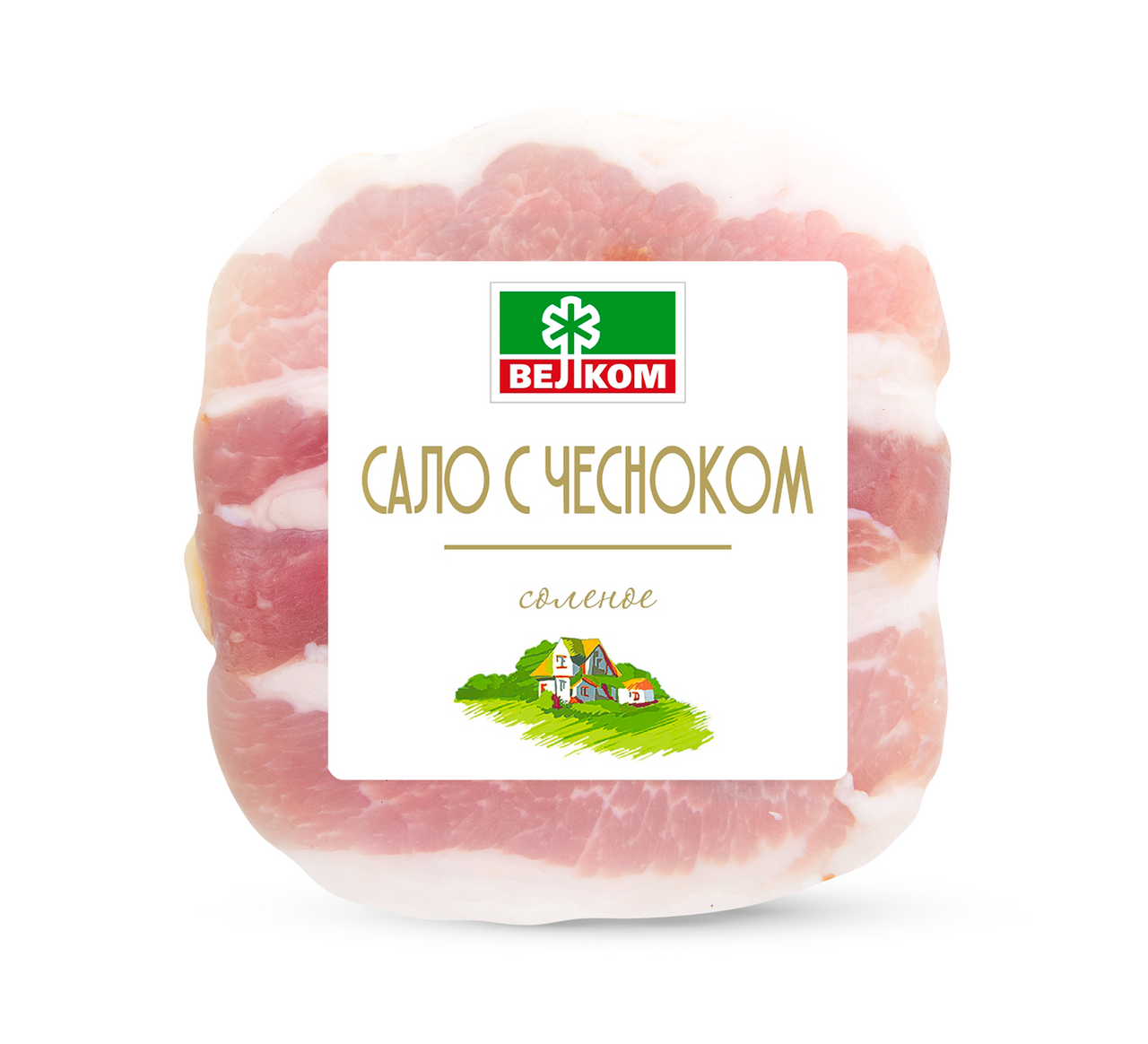 Сало Велком с чесноком — традиционное свиное сало с небольшой прослойкой мяса и ароматными приправами. Продукт обладает насыщенным ароматом и нежным, сбалансированным в отношении соли и специй вкусом. Прекрасно подойдет в качестве дополнения к различным первым или вторым блюдам ли их ингредиента. Подается нарезанным тонкими ломтиками, разложенными на тарелке с зеленью или картофелем.