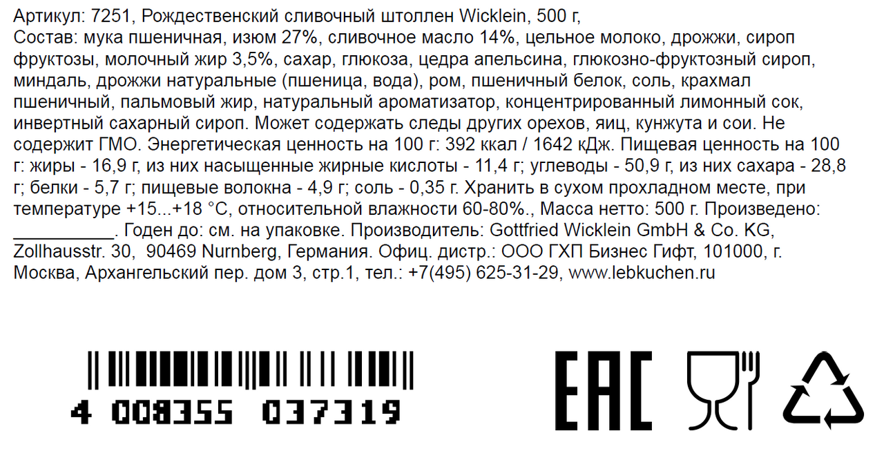 Мука пшеничная, изюм 27%, сливочное масло 14%, цельное молоко, дрожжи, сироп фруктозы, молочный жир 3,5%, сахар, глюкоза, цедра апельсина, глюкозно-фруктозный сироп, миндаль, дрожжи натуральные (пшеница, вода), ром, пшеничный белок, соль, крахмал пшеничный, пальмовый жир, натуральный ароматизатор, концентрированный лимонный сок, инвертный сахарный сироп.