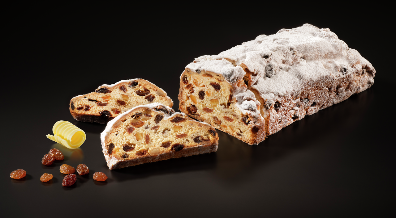 Рождественский штоллен из Нюрнберга на сливочном опарном тесте - это традиционный рождественский кекс с изюмом, апельсиновой и лимонной цедрой, ромом и тростниковым сахаром.
