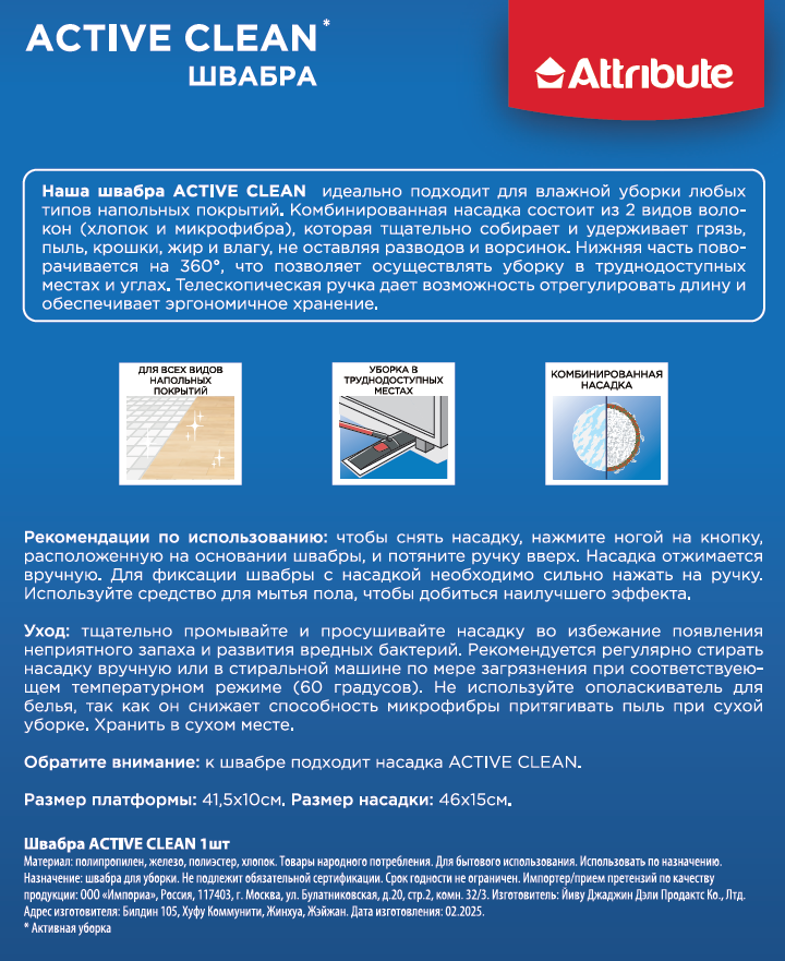 Телескопическая ручка регулируется по длине, что позволяет настроить швабру под индивидуальные параметры. Уборка труднодоступных мест становится проще благодаря подвижному механизму основания. Насадка из микрофибры и хлопка обладает повышенной устойчивостью к износу. Эффективно удаляет пыль, грязь и мелкий мусор. Благодаря наличию хлопка в составе насадку можно стирать в стиральной машине. Высокая степень впитывания жидкости. В��ревочная структура делает насадку плотной и объемной, что упрощает уборку и охватывает большую площадь поверхности.