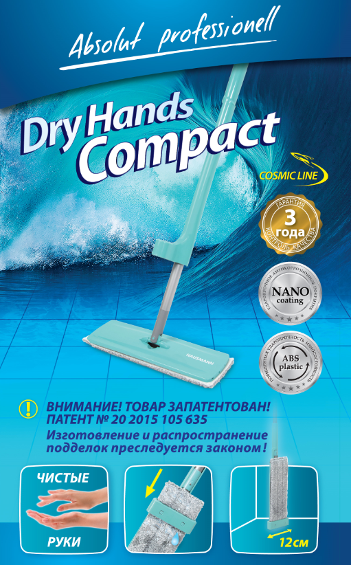 Швабра Hausmann Dry Hands Compact микрофибра с механизмом отжима предназначена для влажной уборки любых видов напольных покрытий и относится к системе чистые руки. Благодаря встроенному механизму отжима, уборка проходит в разы быстрее и легче, а руки не страдают от моющих средств. Система отжима одним движением отжимает насадку. Швабра идеально подходит для уборки квартир до 100 кв. м. Ручка из вспененного пластика, удобная для захвата двумя руками, защищает руки от образования мозолей. Швабра производится из ударопрочного ABS пластика. Равномерный прижим платформы к полу позволяет делать уборку без разводов. Насадка швабры из микрофибры обладает хорошей способностью впитывать и удерживать воду, легко отжимается, не впитывает запахи, прочно крепится к платформе швабры на липучки и выдерживает до 600 циклов уборки. Насадку можно стирать в стиральной машинке при температуре 60 градусов. После использования швабру можно хранить в вертикальном положении – система отжима в крайнем положении выполняет функцию опоры. На ручке швабры есть петля для подвеса на крючок, что также позволяет хранить ее компактно.