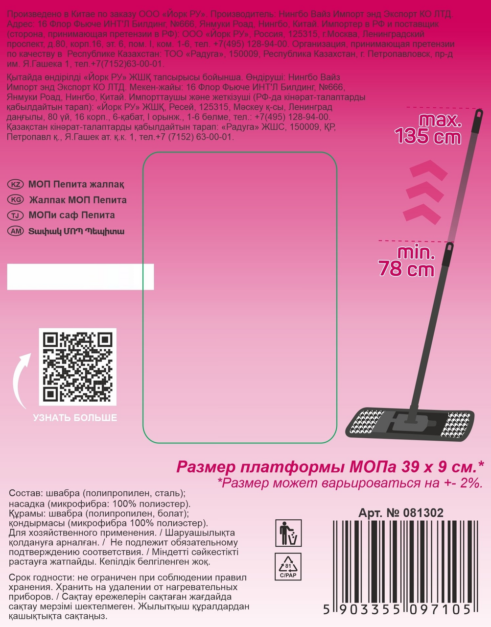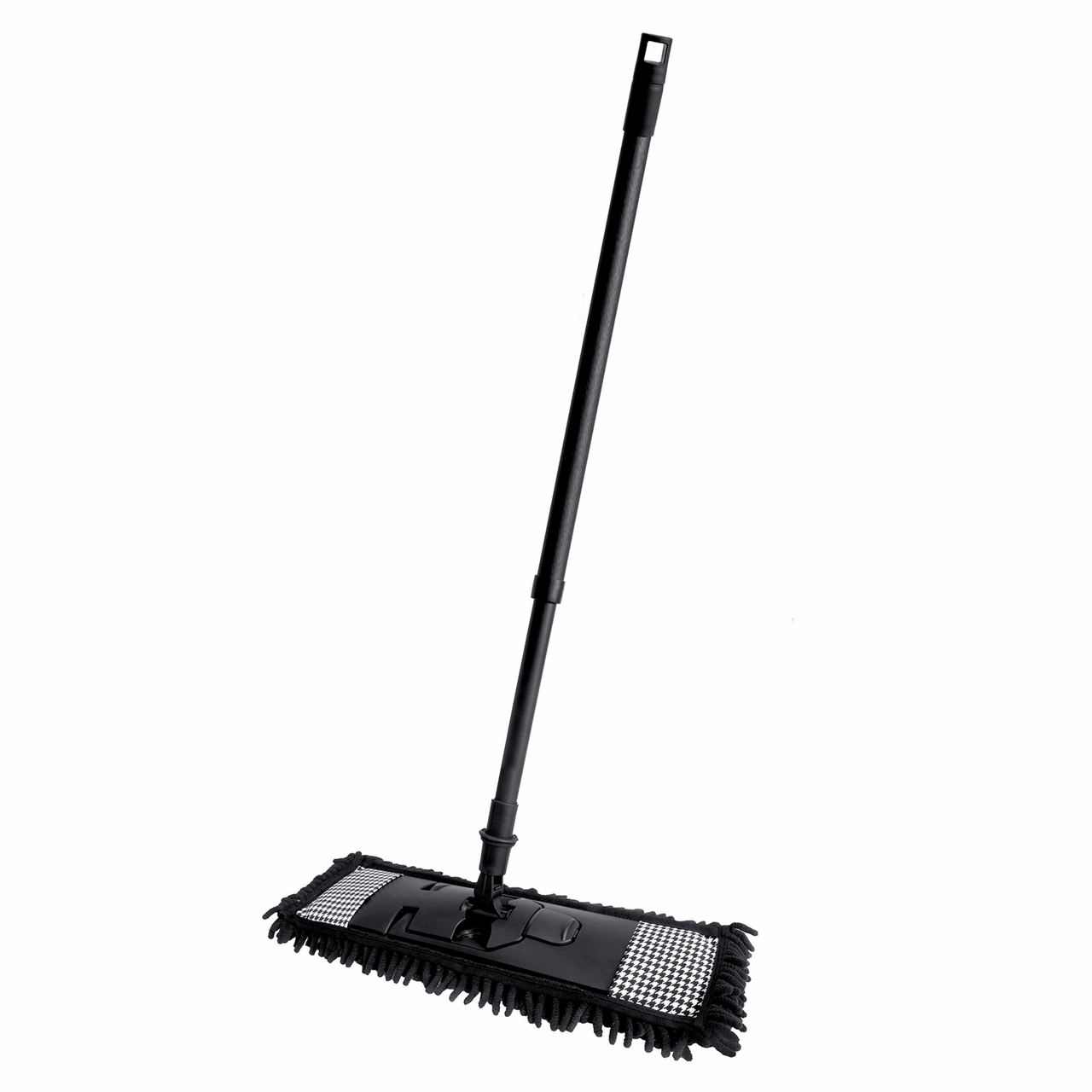 Стильная швабра дополнит коллекцию из 12 предметов. Оснащена телескопической рукояткой (78-135 см). Благодаря черному матовому покрытию рукоятка не выскальзывает из рук и надолго сохраняет внешний вид. Складное основание позволяет легко надеть и снять насадку. Насадка состоит из множества макарон, что увеличивает площадь контакта швабры с поверхностью. Для этой швабры используется высококачественная микрофибра: легко собирает грязь, не оставляя разводов. Эффективна без моющих средств - экономит их использование. Высококачественная плоская швабра в стильном дизайне для ежедневной уборки. Универсальное применение: для влажной или сухой уборки любых поверхностей.
