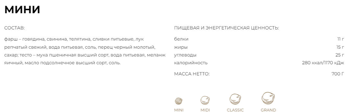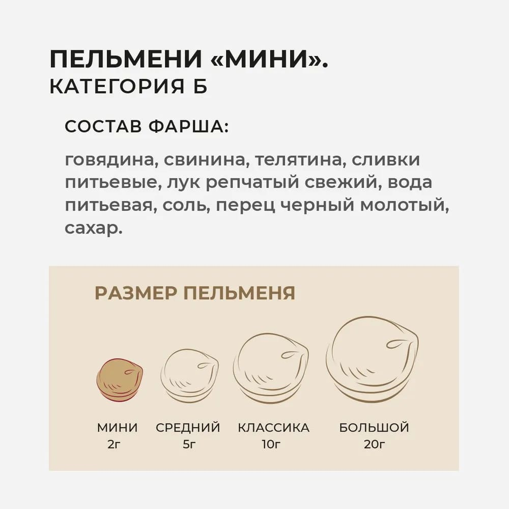 В пельменях серии Мини от Sибирской коллекции весом 2 г - много удовольствия и пользы! Нежная начинка с телятиной и натуральными сливками, пониженное содержание соли и полное отсутствие ГМО и соевых белков.