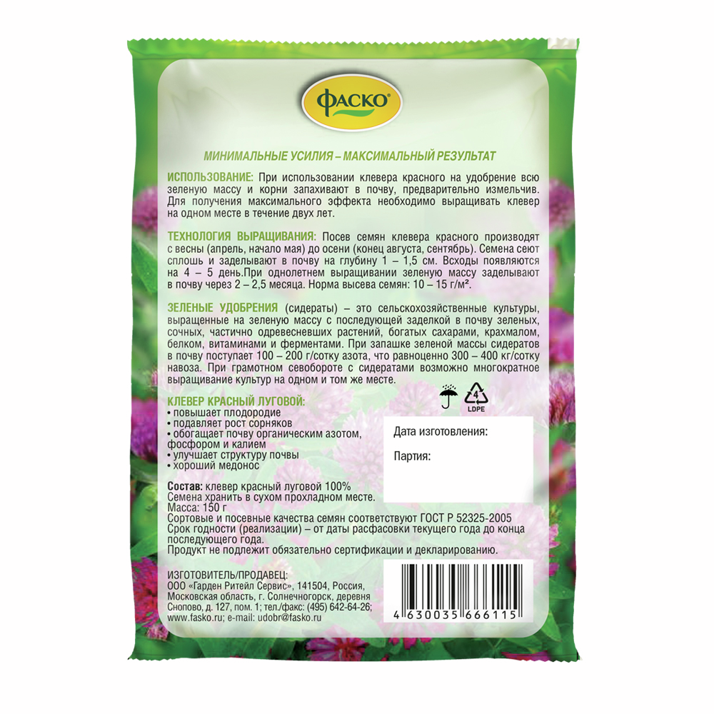 Сидерат Фаско Клевер Красный — весом около 150 г представляет собой средство для улучшения почвы и выращивается специально для получения зеленой массы. Красный клевер, из которого он изготовлен, известен своей способностью повышать плодородие почвы. Именно поэтому подобное удобрение активно применяется в сельском хозяйстве и садоводстве, помогая бороться с сорняками и очищать почву. Клевер Красный обладает способностью повы��ать качество грунта и уровень плодородия, а также является источником ценных питательных веществ, способствующих росту и развитию растений. Рекомендуется регулярно поливать его после заделки в почву, чтобы обеспечить оптимальные условия для прорастания и развития. После этого удобрение активно разлагается и превращается в органическое вещество, питающее ваши растения. Выбирая Сидерат Фаско Клевер Красный, вы делаете правильный выбор в пользу экологического сельского хозяйства и заботы о плодородии почвы. Этот продукт идеально подходит для использования в овощных грядках, ягодных кустарниках, цветочных клумбах и любых других садовых или дачных участках. Позвольте себе насладиться обильным урожаем и красивыми, здоровыми растениями.