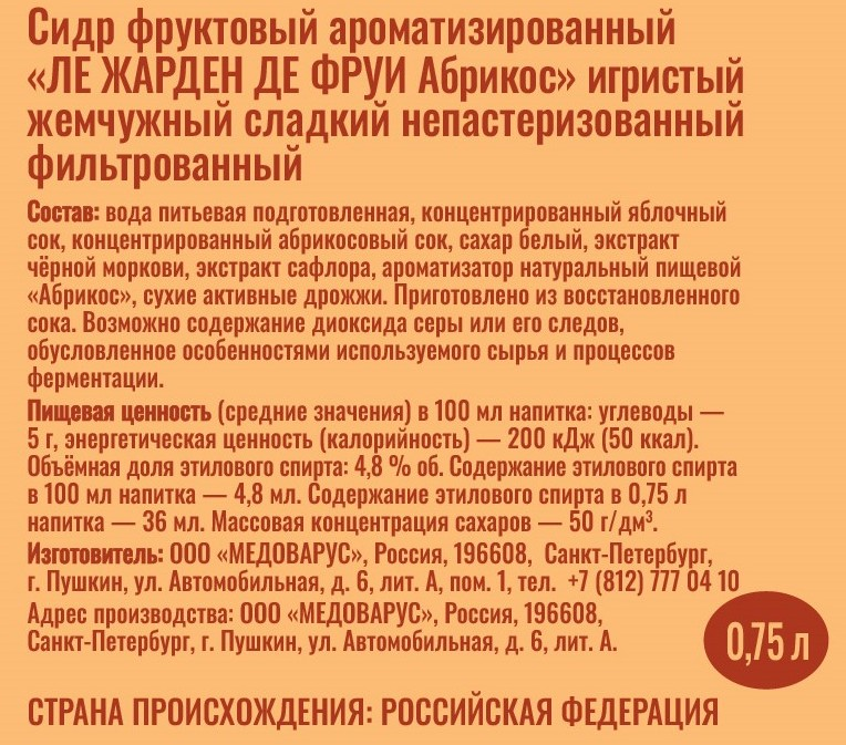 Сидр Medovarus Le Jardin des Fruits абрикос, 0.75л