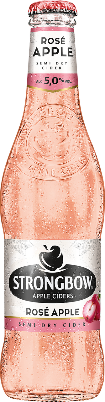 Розовый сидр STRONGBOW, сваренный из редких розово-мякотных яблок в новом полусухом варианте, с пониженным содержанием сахара.