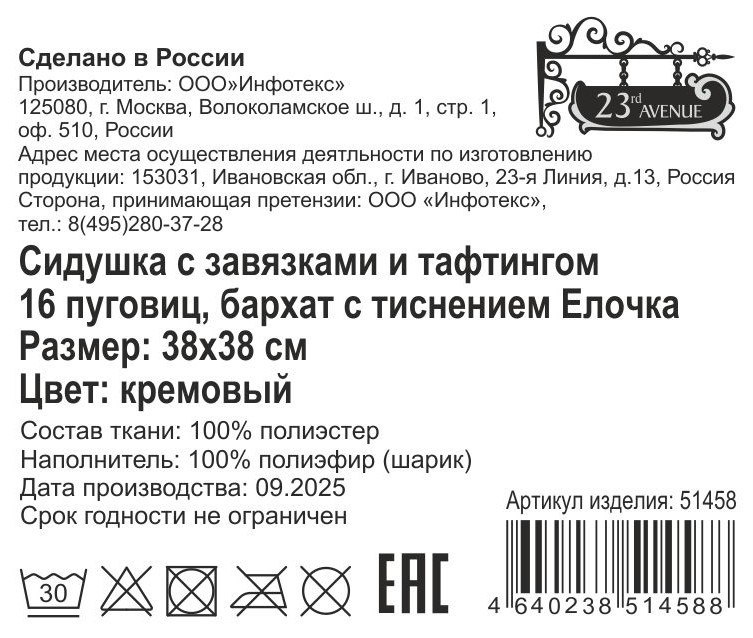 Сидушка 23rd Avenue Herringbone с завязками и тафингом кремовая, 38 x 38см
