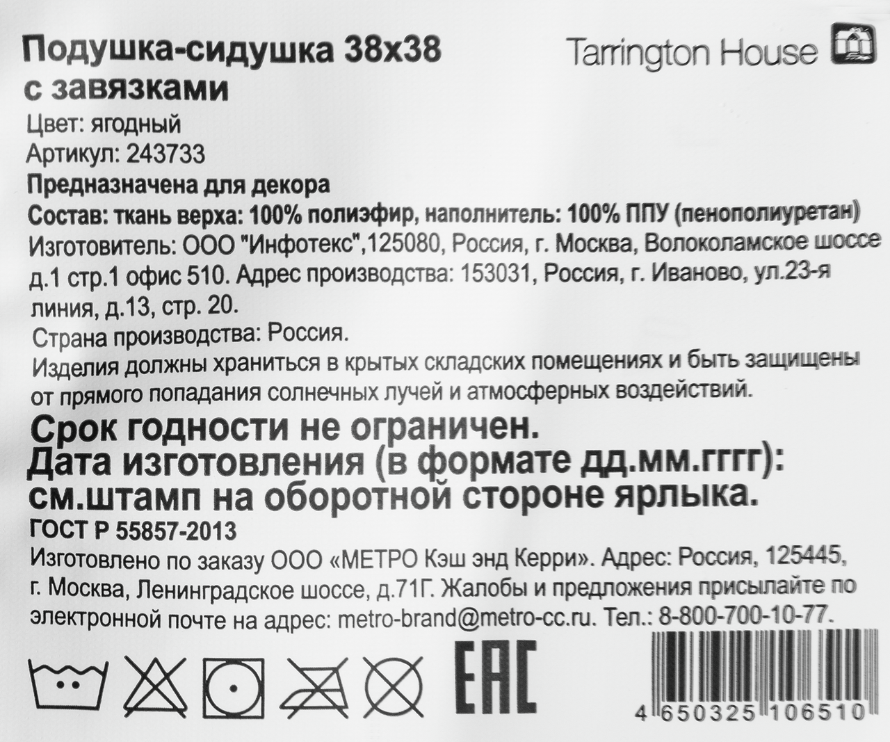 Tarrington House Подушка для мебели ягодная с завязками, 38 x 38см имеет износостойкий материал, наполнитель полиуретан, мягкая, упругая, можно стирать. Модель двухсторонняя, с завязками для фиксации. Стирать изделие следует при температуре 30C в машине. Запрещено гладить, отжимать и сушить в машине, отбеливать.