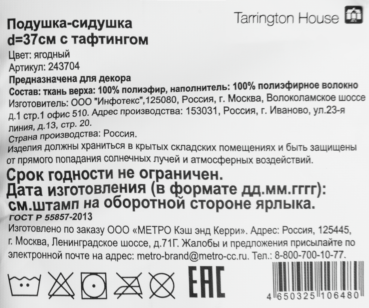 Tarrington House Подушка ягодная для мебели круглая с тафтингом, 37см круглая с тафтингом может быть стильным элементом декора для вашего дома и обеспечивает комфорт во время сидения на стуле с твердой поверхностью, а также защищает дерево или текстиль сиденья от загрязнений.