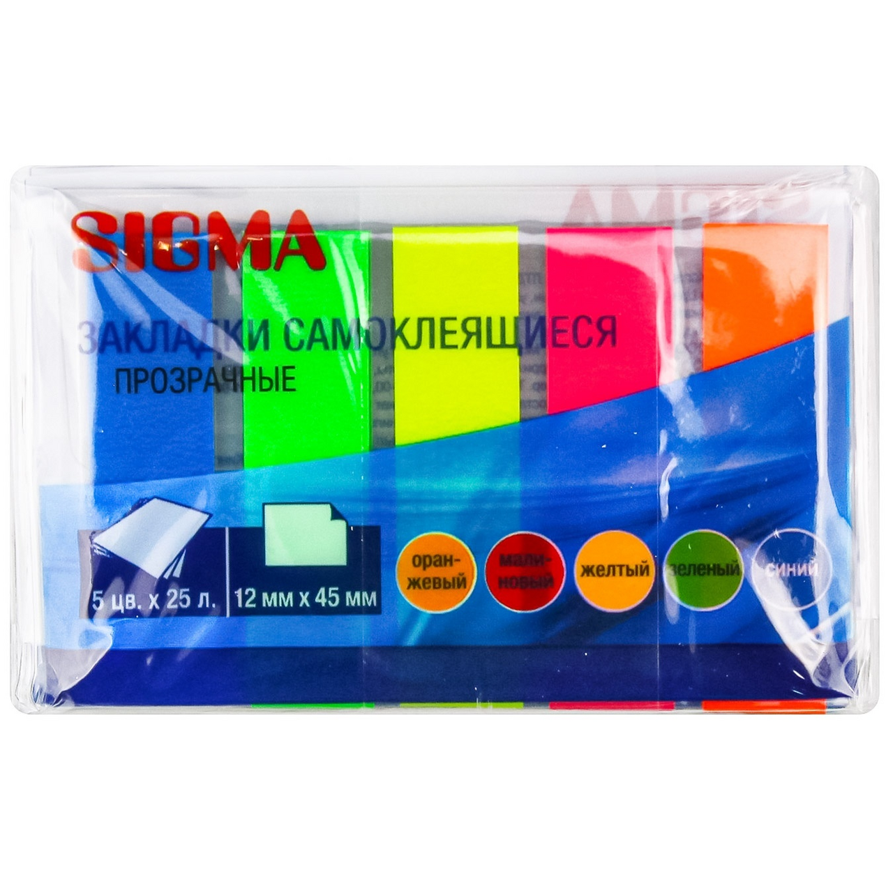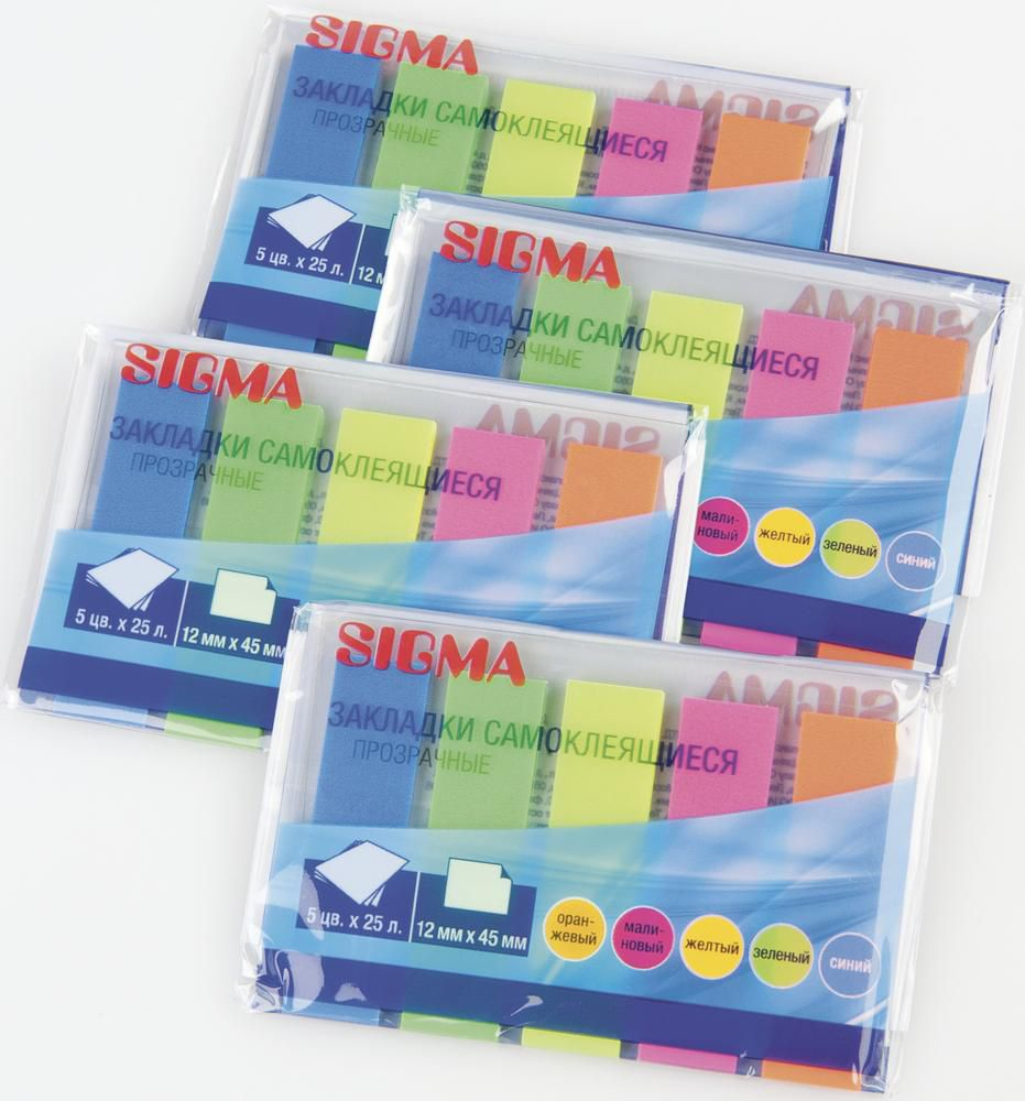 SIGMA Закладки самоклеящиеся прозрачные 45х12мм 5 цв*25л 4 блока
