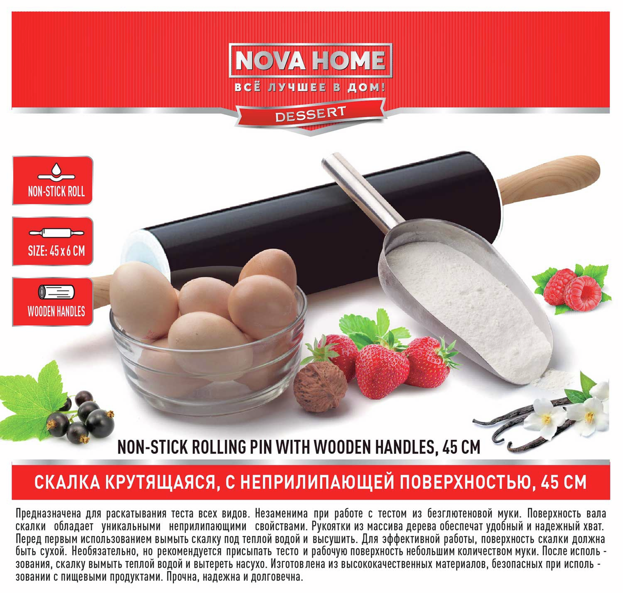 Скалка Nova Home крутящаяся с антипригарным покрытием d-6см, 45см предназначена для раскатывания теста всех видов. Тефлоновая поверхность вала скалки обладает уникальными неприлипающими свойствами, незаменима при работе с тестом из безглютеновой муки. Рукоятки из массива дерева обеспечат удобный и надежный хват.Перед первым использованием вымыть скалку под теплой водой и высушить. Для эффективной работы поверхность скалки должна быть сухой. Необязательно, но рекомендуется присыпать тесто и рабочую поверхность не большим количеством муки. После использования скалку вымыть теплой водой и вытереть насухо. Изготовлена из высококачественных материалов, безопасных при использовании с пищевыми продуктами. Прочна, надежна и долговечна. Длина общая: 45 см, длина рабочей части: 25 см.