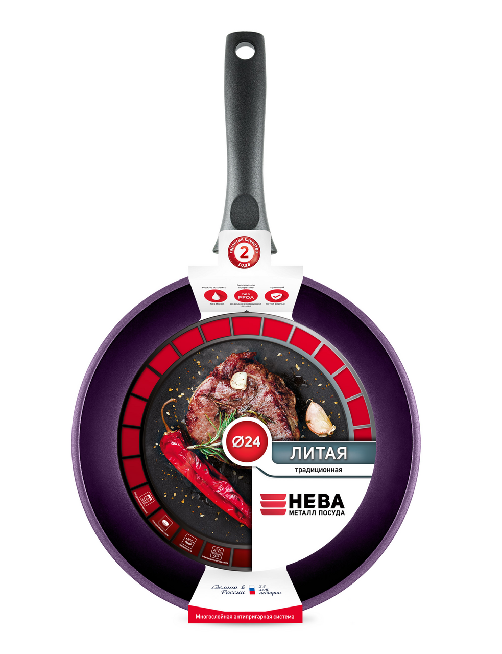 Сковорода Нева металл посуда Violet, 24см предназначена для приготовления различных блюд. Ее можно приобрести для дома или предприятий общественного питания (баров, ресторанов, столовых, кафе и пр.). Дно и борта сковороды с антипригарным покрытием, которое позволяет жарить продукты с минимальным количеством масла или без использования каких-либо жиров. Сковорода совместима с любыми плитами (электрической, газовой, стеклокерамической) кроме индукционной. Хотя ее ручка несъемная ручка, она не нагревается в процессе приготовления блюд. Пластик не деформируется при воздействии высоких температур, что дает возможность использовать ее в качестве формы для запекания. Изготовлена сковорода из алюминия. Этот прочный и надежный материал, который не теряет своих качеств даже при длительной и активной эксплуатации. Он устойчив к воздействию высоких температур. При нагревании не выделяет токсичных или опасных веществ, не содержит вредных примесей. При контакте с продуктами не окисляется, не меняет вкус готовых блюд, не впитывает запахи и не подвержен коррозии. Ухаживать за изделием просто. Его моют под горячей или холодной проточной водой с моющими средствами или без таковых. При этом не рекомендуется использовать жесткие щетки и абразивные материалы, которые могут повредить антипригарное покрытие. Разрешается мытье в посудомоечной машине.