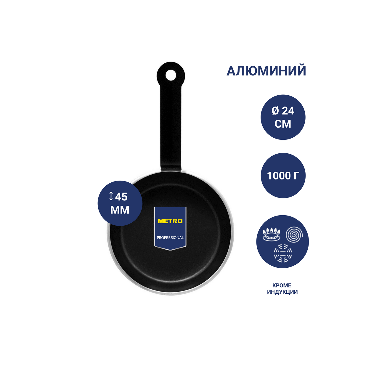 METRO PROFESSIONAL Сковорода, 24 см предназначена для приготовления вкусных и ароматных блюд на всех видах плит, кроме индукционной. Она имеет антипригарное покрытие и изготовлена из высококачественного штампованного алюминия. Материал обеспечивает длительное использование и прочность. На сковороде можно готовить различные блюда: от яичницы до блинов, от омлета с овощами до жаркого с добавлением специй и соусов. Антипригарное покрытие позволяет легко готовить пищу без прилипания к сковороде, что упрощает процесс и облегчает очистку после использования. Благодаря специальному покрытию больше не требуется использовать растительное масло в больших количествах. Блюда получаются более здоровыми и низкокалорийными. Равномерный нагрев позволяет избежать пережаривания пищи. Эргономичная ручка обеспечивает на кухне полную безопасность, исключает контакт с горячими стенками посуды. Модель выполнена в минималистском стиле и органично вписывается в любой интерьер.