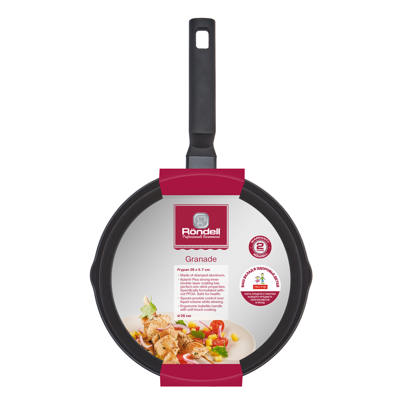 Сковорода Rondell Granade, 26см изготовлена из штампованного алюминия. Толщина стенок 2,3мм, дна 2,8мм. Прочное внутреннее двухслойное покрытие Xylan Plus отличается превосходными антипригарными свойствами. Не содержит PFOA. Безопасно для здоровья. Нельзя использовать металлические лопатки. Не режьте на покрытии ножом, это приведёт к его повреждению. Внешнее термостойкое покрытие обеспечивает легкий уход. Наличие сливов позволяет контролировать объем жидкости при тушении. Эргономичная бакелитовая ручка с soft touch покрытием. Подходит для всех видов плит, включая индукционные. Не рекомендуется мыть в посудомоечной машине во избежание повреждения soft touch покрытия на аксессуарах. Не подходит для духовки. Гарантия 2 года. Подойдет для приготовления разнообразных блюд. Изделие выполнено из прочного материала, за счет чего отличается долгим сроком службы. Наличие антипригарного покрытия облегчает процесс готовки. Имеет гладкую поверхность, поэтому легко моется. Ручка имеет европодвес, поэтому сковороду можно хранить вертикально.Xylan Plus – двухслойное, долговечное антипригарное покрытие для интенсивного использования.