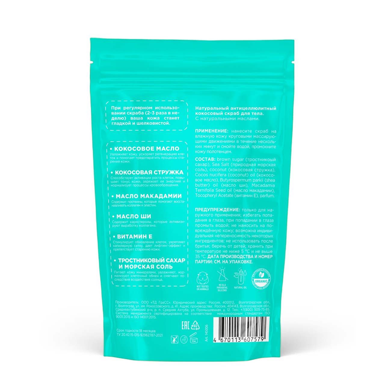 Подарит коже тела, рук и ног бережное очищение, глубокое питание и увлажнение кожи, мгновенное восстановление её упругости и эластичности. Увлажняющий и питающий скраб для тела выравнивает рельеф, интенсивно питает и смягчает кожу, делая её невероятно гладкой и мягкой на ощупь. Лимфодренажный подтягивающий скраб для тела делает контуры фигуры более четкими, способствуя снятию отеков и предупреждению целлюлита, бережно отшелушивает ороговевшие клетки и ускоряет обновление верхнего слоя кожи. Скрабы хорошо подойдут для использования в бане и для обёртывания. При регулярном использование скраба кожа станет гладкой и шелковистой. Приятный бонус - стильная упаковка, которую можно подарить. Входящие в состав тростниковый сахар увлажняет, улучшает рельеф, придает гладкость. Масло ши содержит каристеролы, которые позволяют активизировать выработку коллагена. Кокосовая стружка способствует активации роста клеток, повышает тонус кожи, заряжает ее энергией и нормализуют процессы кровообращения. Морская соль подпитывает кожу минералами, увлажняет, снимает отечность, нормализует клеточный обмен. Витамин Е стимулирует обновление клеток, укрепляет капиллярную сетку, дает лифтинг-эффект и препятствует старению кожи. Масло кокоса увлажняет и восстанавливает эластичность. Масло макадамии содержит протеины, которые помогают восстанавливать коллаген и эластин.