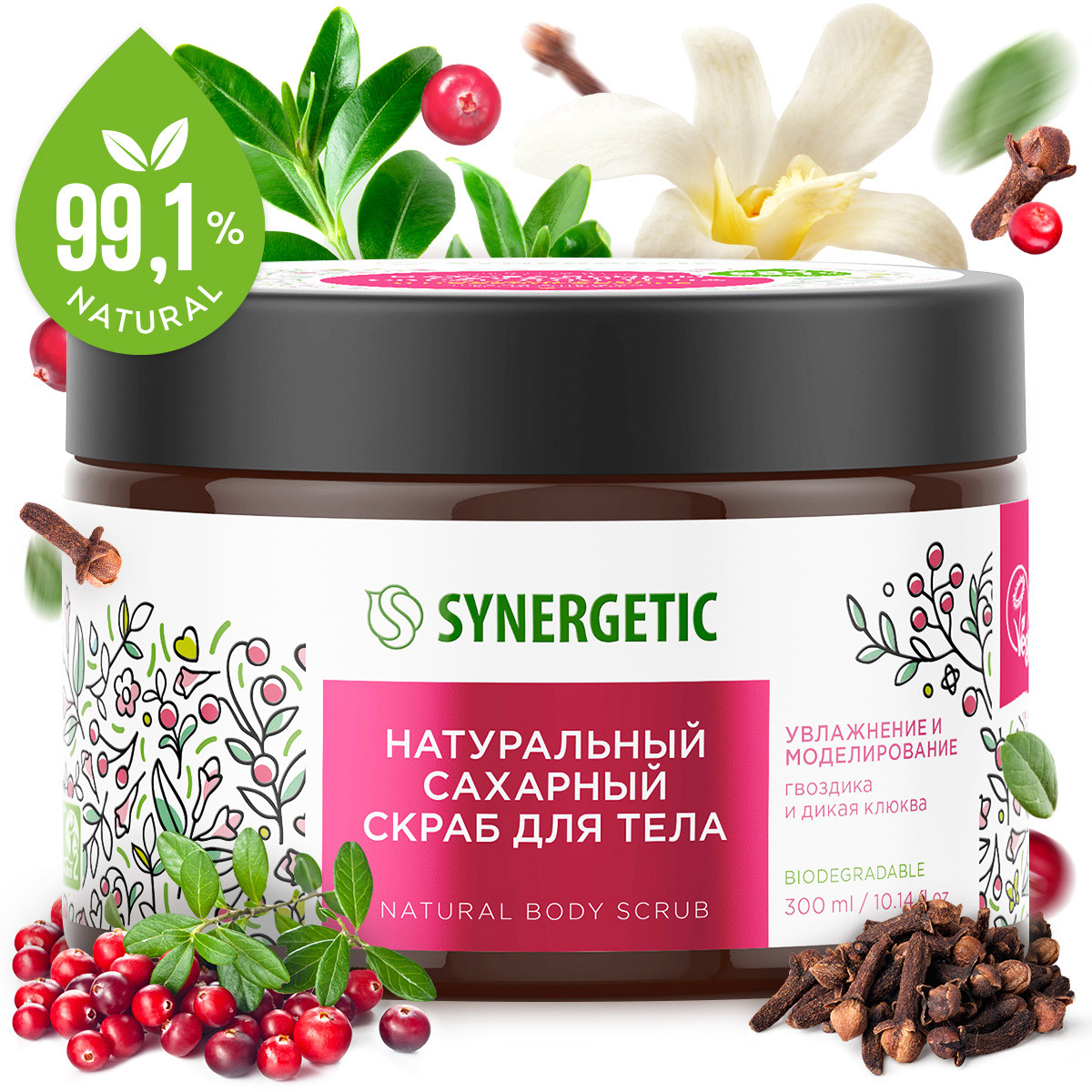 Натуральный сахарный скраб для тела Synergetic увлажнение и моделирование, гвоздика и дикая клюква – это эффективное средство для ухода за кожей, более чем на 99% состоящее из натуральных компонентов. Скраб деликатно отшелушивает, очищает и тонизирует кожу. Масло карите интенсивно питает, делая кожу гладкой и подтянутой, а экстракт клюквы обогащает кожу комплексом витаминов и микроэлемент��в и способствуют регенерации кожи. Комплекс масел миндаля и кокоса интенсивно питает, увлажняет и восстанавливает нежную кожу, придавая упругость и бархатистость.