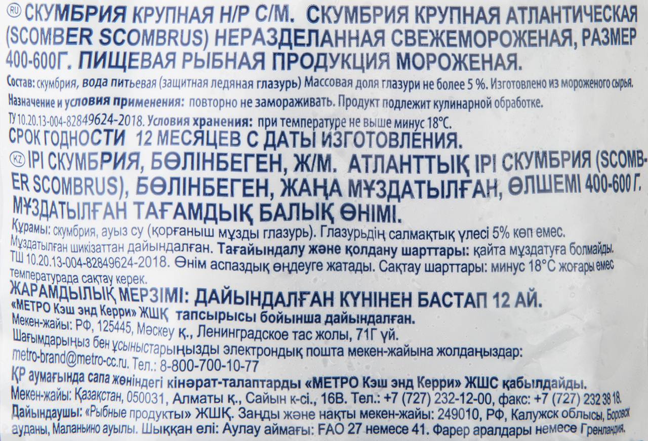 Скумбрия METRO Chef неразделанная свежемороженая – полезная для здоровья и низкокалорийная рыба, в состав которой входит большое количество витаминов, жирных кислот и минеральных элементов. Она обладает нежной мякотью и выразительным вкусом, благодаря чему широко используется в кулинарии. Скумбрию применяют для жарки, запекания, засолки, подвергают как холодному, так и горячему копчению. При включении в регулярный рацион эта рыба способна принести большую пользу организму. Ее употребление способствует снижению веса и нормализации пищеварения, улучшает состояние кожи, волос и ногтей, помогает нарастить мышечную массу за счет легко усваивающегося человеком белка. Скумбрия положительно сказывается на работе сердца и здоровье сосудов, является продлевающим молодость природным антиоксидантом, благотворно влияет на состояние суставов, улучшает мозговую деятельность, укрепляет иммунные силы. Выпуская продукцию под собственными торговыми марками METRO, мы стремимся максимально удовлетворить потребности наших клиентов. Наша цель – понять, какой ассортимент для них актуален и предложить его по привлекательной цене. Мы также внимательно изучаем тенденции рынка, чтобы быть в курсе последних трендов и своевременно предлагать решения под собственными торговыми марками в соответствии с ними. Бренд METRO Chef хорошо известен во всем мире. Продукция этой торговой марки отличается отменным вкусом и превосходным качеством.