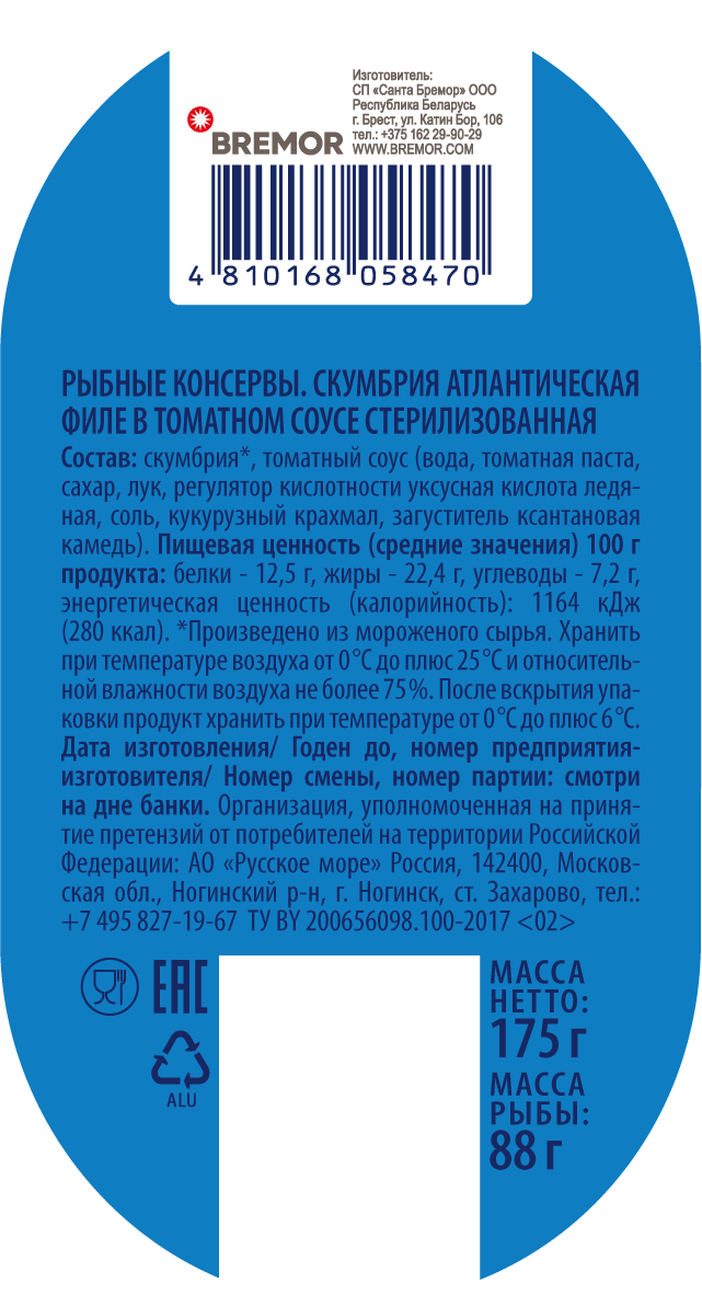 Скумбрия, томатный соус (вода, томатная паста, сахар, лук, регулятор кислотности уксусная кислота ледяная, соль, загустители: Е1422, ксантановая камедь).