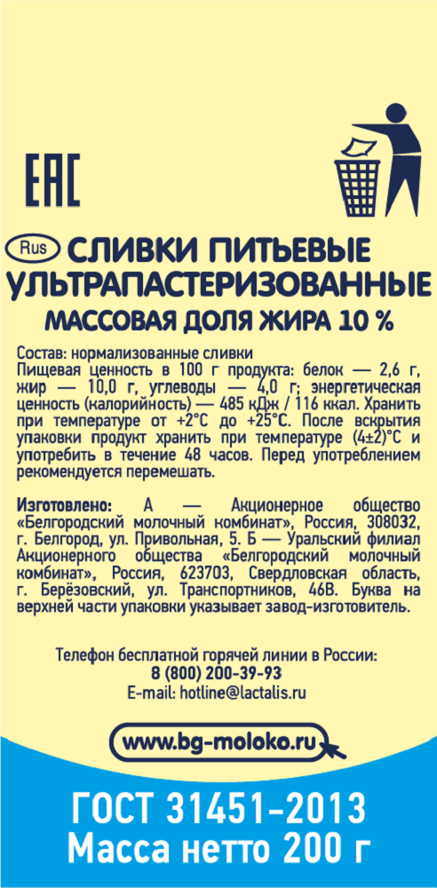 Сливки Белый город ультрапастеризованные 10%, 200г