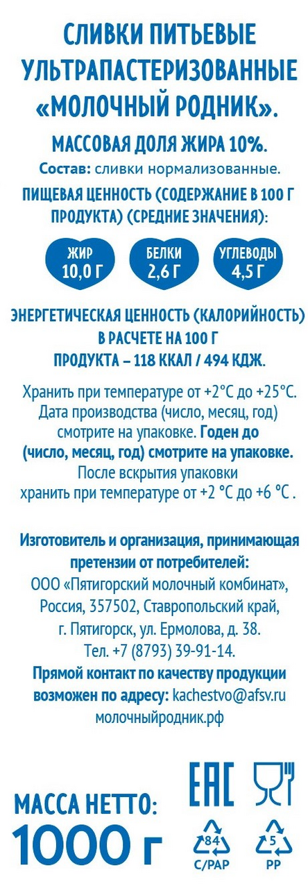 Сливки Молочный родник ультрапастеризованные 10%, 1кг