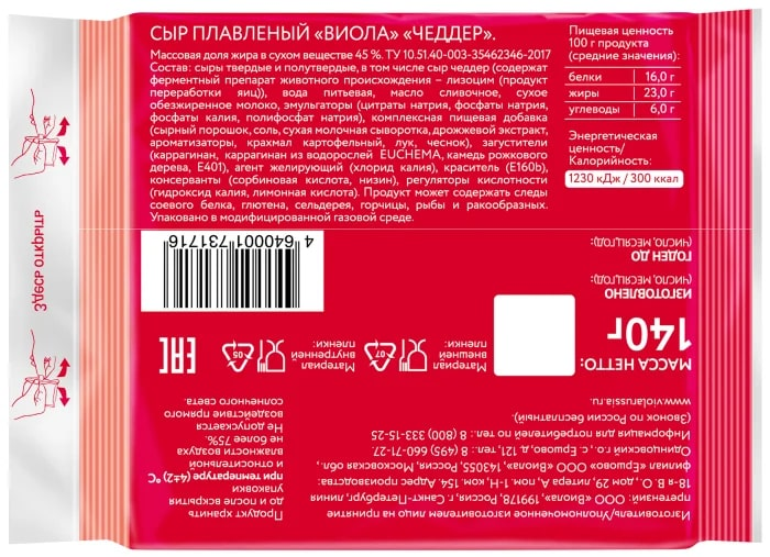 Сыр плавленый сливочный Виола четыре сыра 60%, 140г БЗМЖ производится из нескольких сортов сыров – Гауда, Пармезан, Маасдам, Чеддер. Такая комбинация позволяет добиться неповторимого сливочного вкуса. Плавленый сыр выпускается в упаковке нескольких видов – в ванночке, в виде порционных слайсов для бутербродов и треугольников в фольге. Разнообразные добавки (ветчина, грибы) позволяют каждому выбрать сыр по вкусу. Благодаря разнообразию упаковки, его удобно использовать дома или брать с собой в путешествия, на работу или учебу. При производстве сыра не добавляются растительные жиры и загустители.