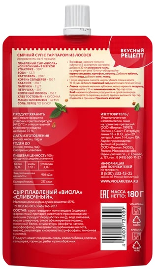 Сыр плавленый сливочный Viola дой-пак 45%, 180г МДЖ приготовлен с применением твердых сырных сортов и сливочного масла. Это делает его таким нежным, насыщенным и вкусным. В составе отсутствуют ГМО, стабилизаторы, растительные жиры. Тягучая консистенция позволяет легко намазывать сыр на тосты и бутерброды. Он прекрасно выдерживает термообработку, поэтому используется при приготовлении пицц, супов и соусов. За счет мягкой упаковки продукт хорошо выдавливается и не растекается. К тому же она полностью герметична, сохраняет качества сыра на всем сроке годности без его порчи и заветривания.