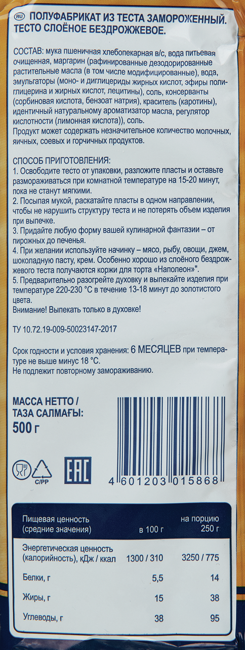 METRO Chef Тесто слоеное бездрожжевое замороженное, 500г стало уже одним из основных компонентов самых разных лакомств в повседневной жизни современных людей. Далеко не каждый решится приготовить его самостоятельно, ведь придется потратить немало времени и сил. Поэтому гораздо проще купить уже готовое тесто! Превосходное качество и сливочный вкус теста гарантируют отличный результат Ваших кулинарных экспериментов.