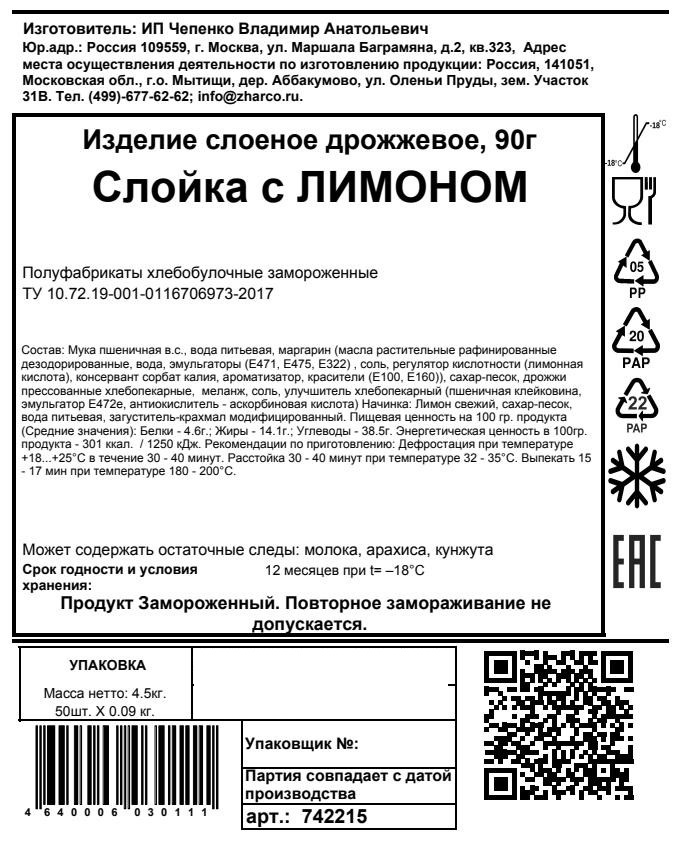 Слойка с лимоном (90г x 50шт), 4.5кг